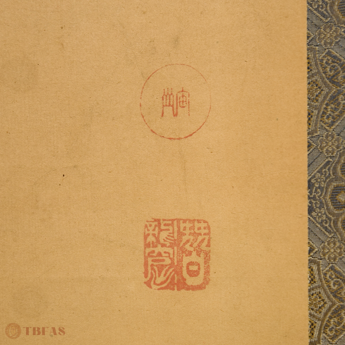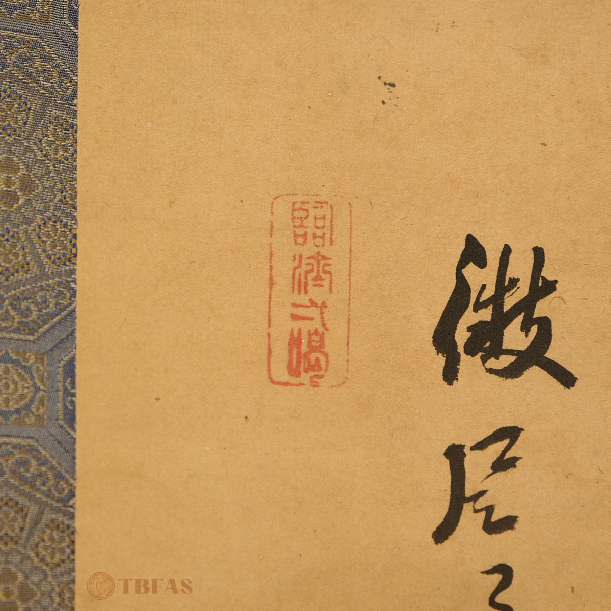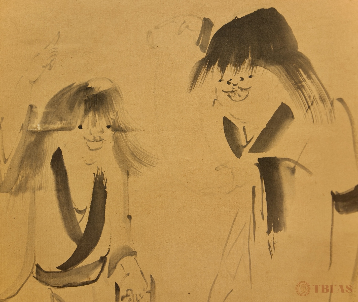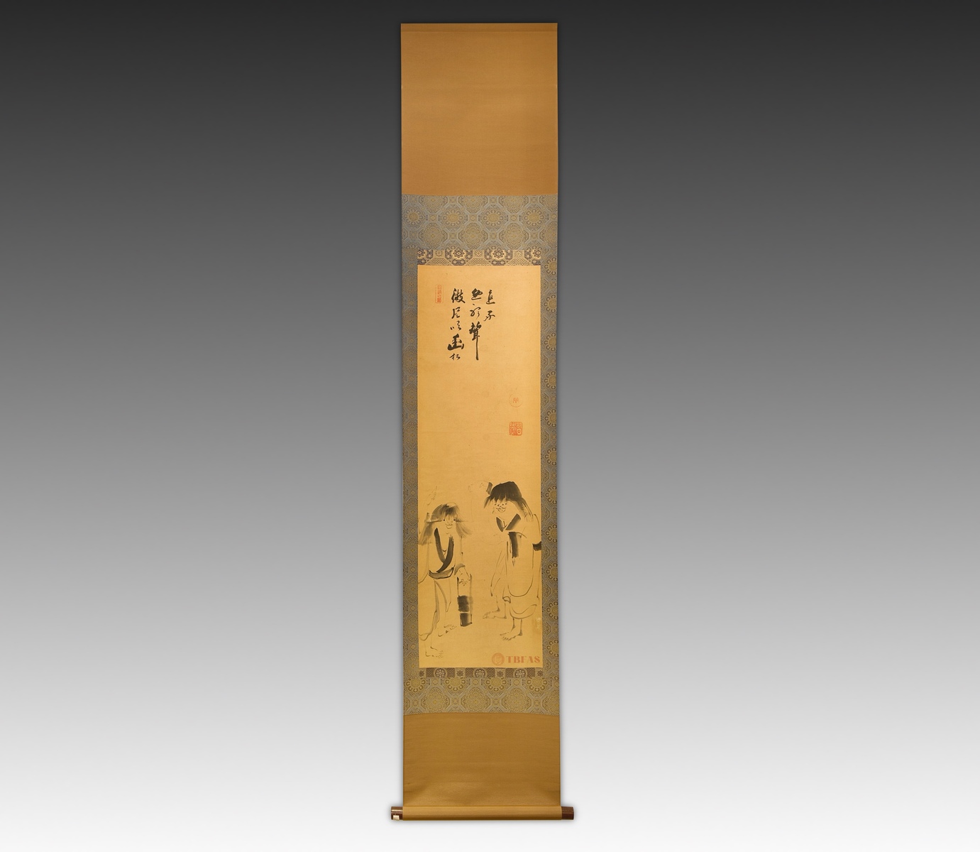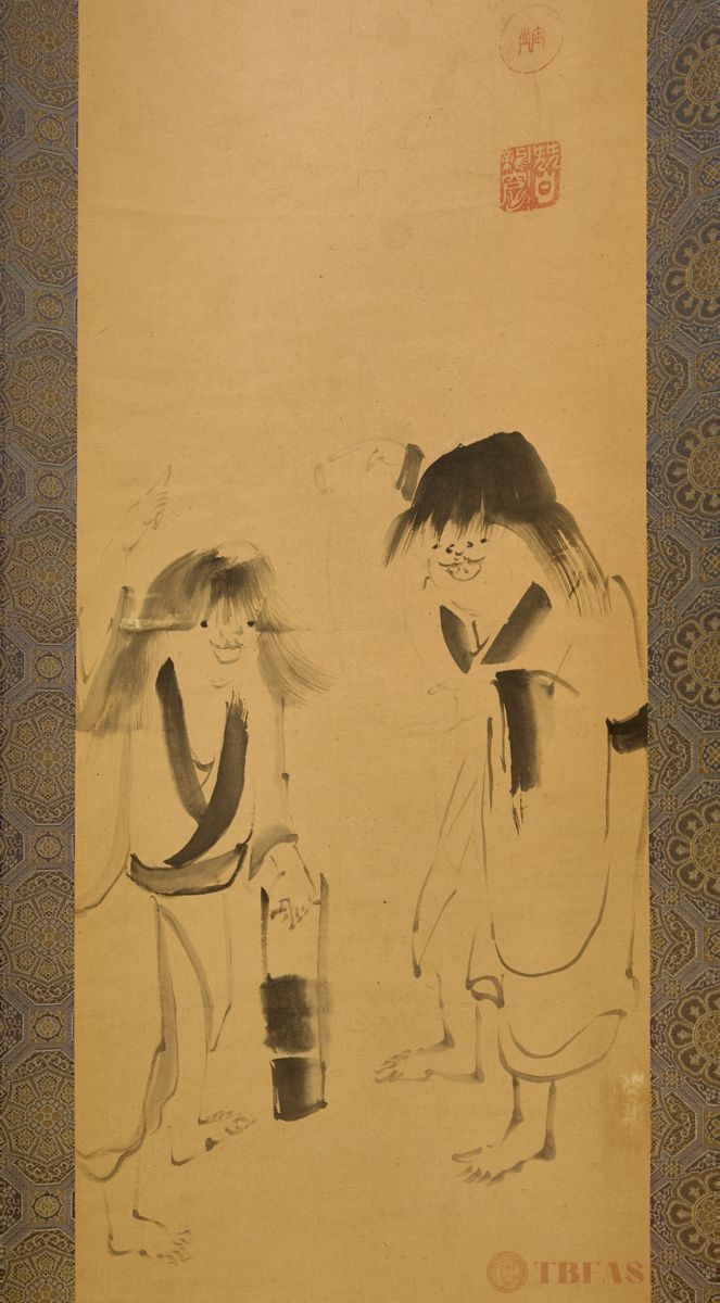 19th century Japanese scroll of Kanzan (Han-shan) and Jittoku (Shih-te) who are two of the most popular Zen figures. They were two eccentrics who were said to have lived on a mountain in China in the eighth or ninth century. Kanzan resided in a cave and was visited each day by Jittoku, a kitchen helper at one of the big monasteries on the mountain, who brought along table scraps for them to share. Collections of their poetry were highly valued by Zen Buddhists in Japan.