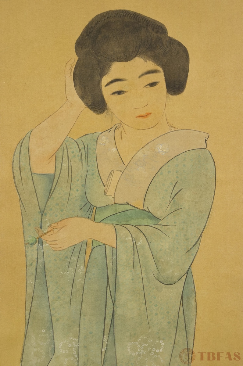 工笔仕女。昭和(1930)。设色绢本立轴。质优。