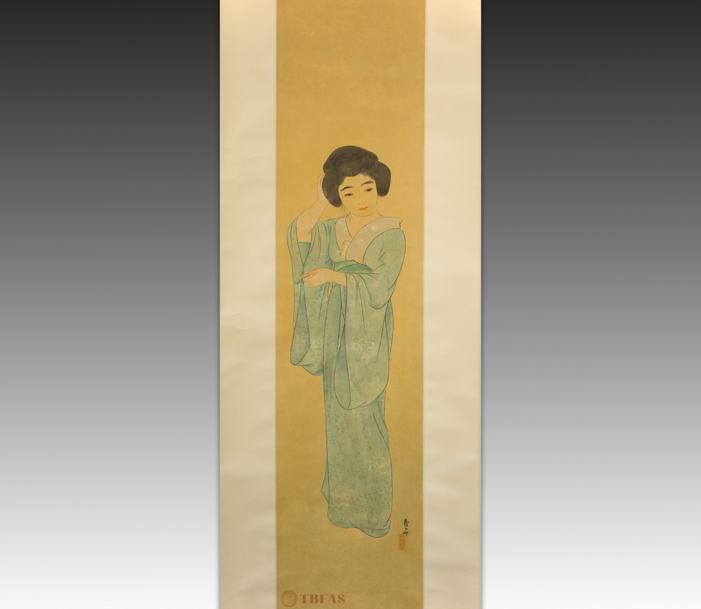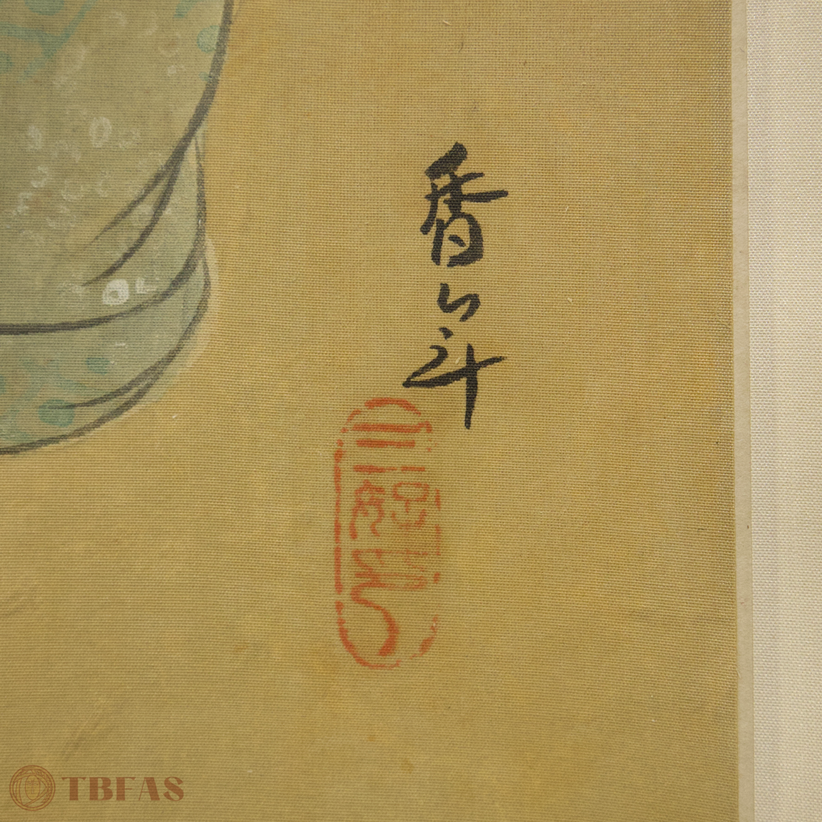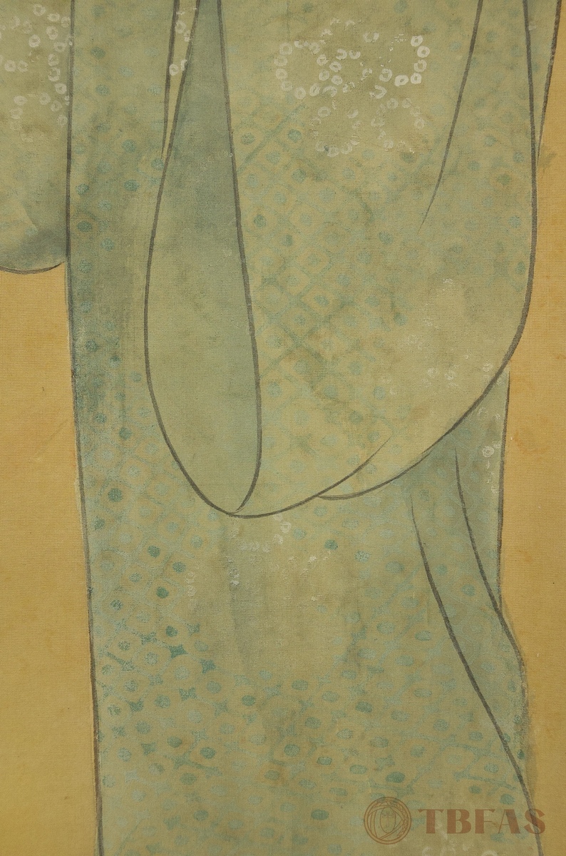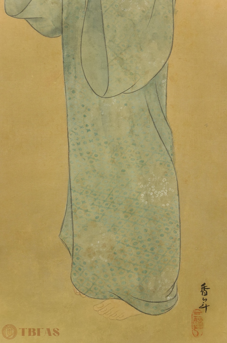 Japanese painting on silk, ca 1930. This is a very straightforward and simple painting in one sense, because a large amount of negative space is behind and around the figure. This technique, rather than making the image lonely or isolated in space, has become a dramatizing element whereby the entire focus is on the central image of the young beauty. The painting is signed by an undocumented artist, Ko Nen, and there is a seal area with an art name, San Ko. This is not an uncommon circumstance with Japanese and Chinese paintings where an artist is, at casual moments or relaxed circumstances, painting things not intended to be taken as major works of art, but more as expressions of inspiration and grasping the nature of a particular image or circumstance.