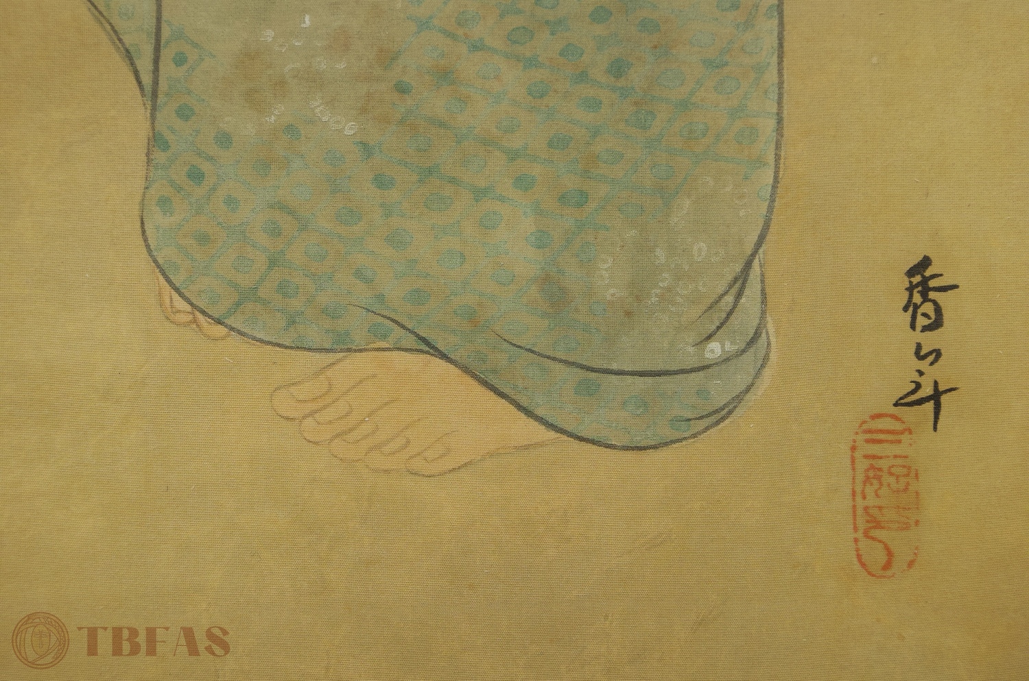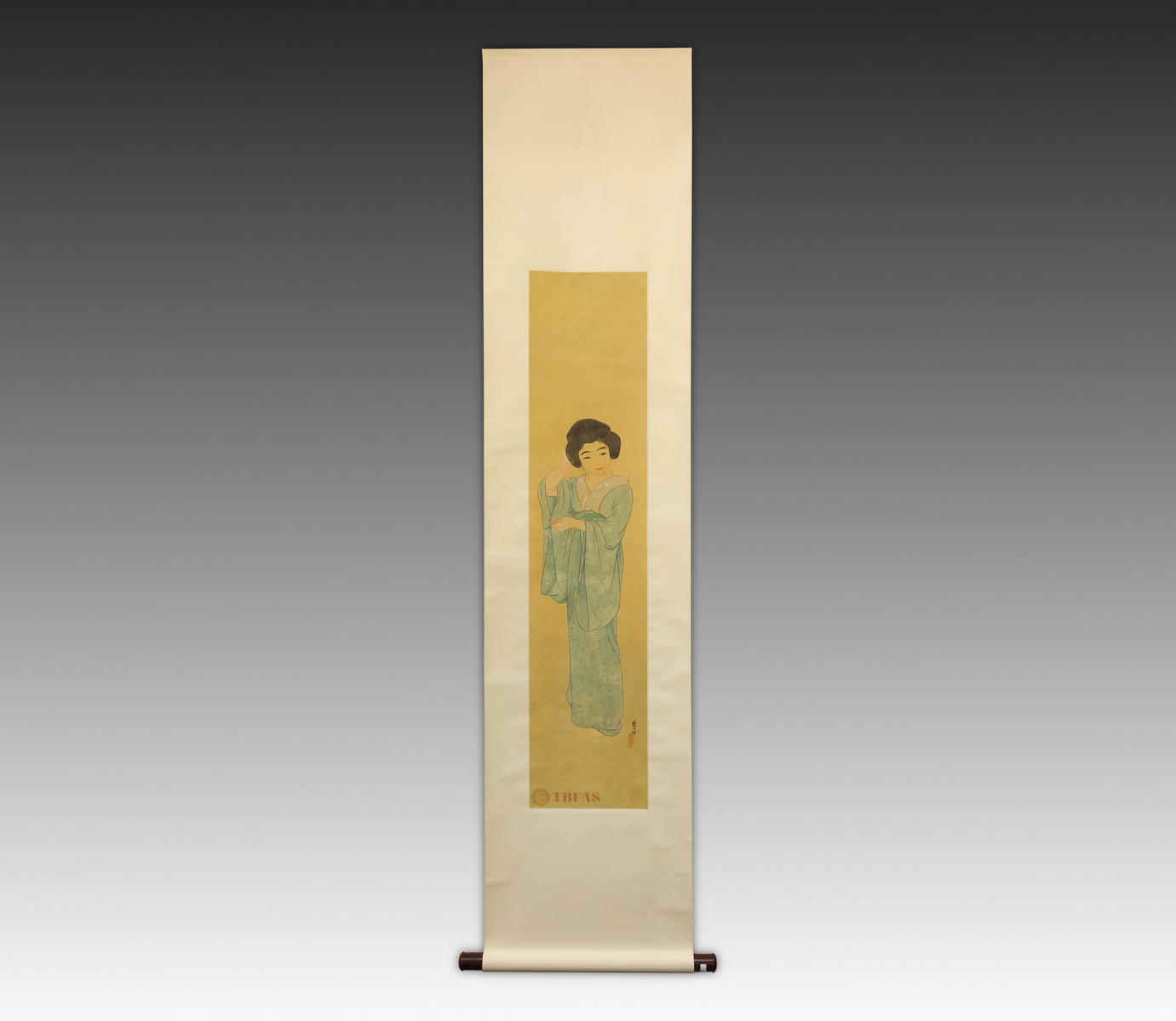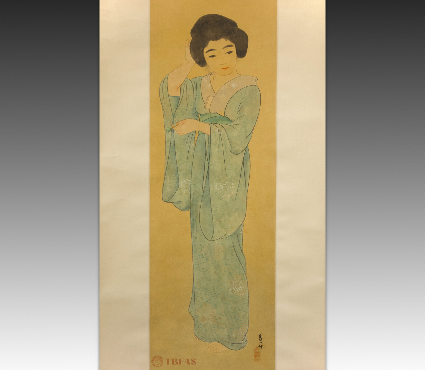 Japanese painting on silk, ca 1930. This is a very straightforward and simple painting in one sense, because a large amount of negative space is behind and around the figure. This technique, rather than making the image lonely or isolated in space, has become a dramatizing element whereby the entire focus is on the central image of the young beauty. The painting is signed by an undocumented artist, Ko Nen, and there is a seal area with an art name, San Ko. This is not an uncommon circumstance with Japanese and Chinese paintings where an artist is, at casual moments or relaxed circumstances, painting things not intended to be taken as major works of art, but more as expressions of inspiration and grasping the nature of a particular image or circumstance.