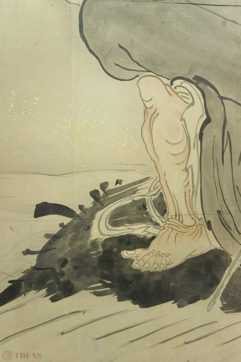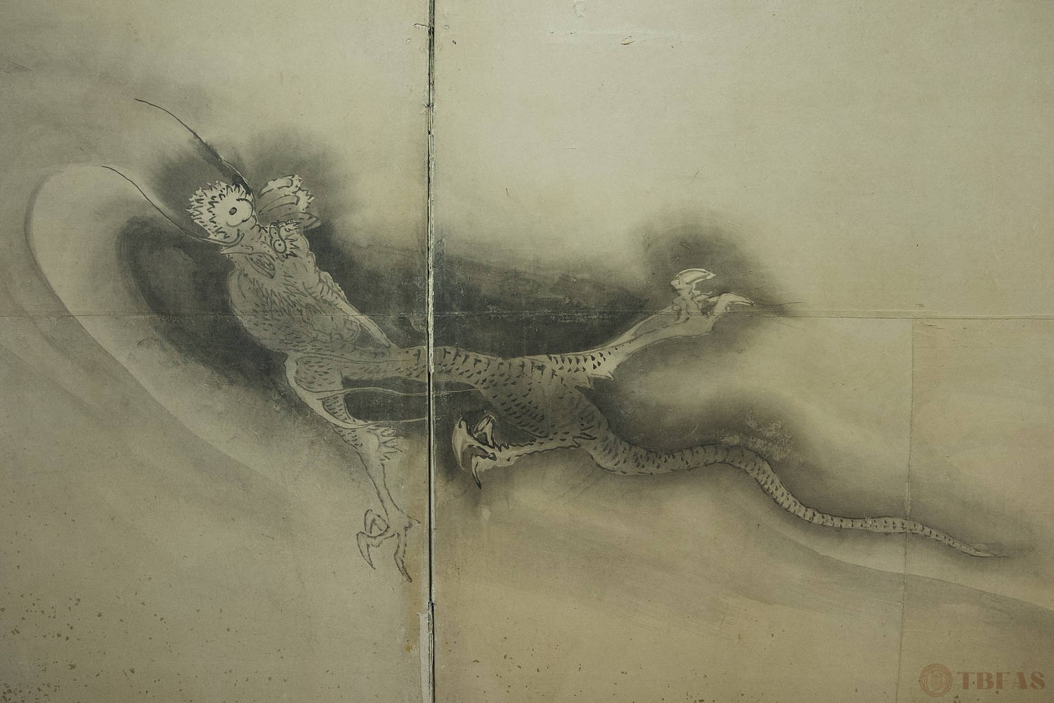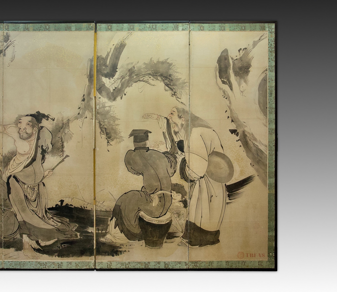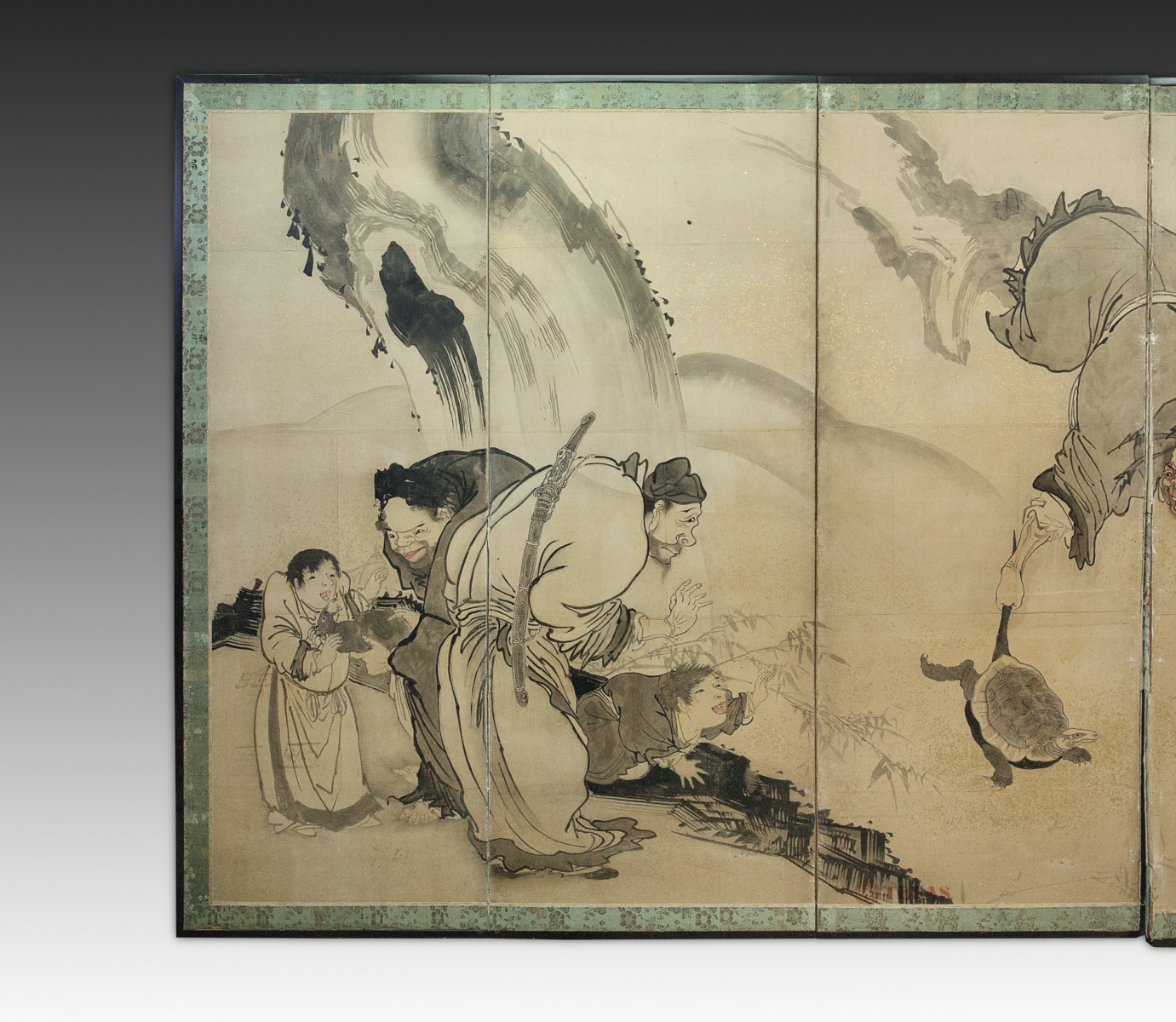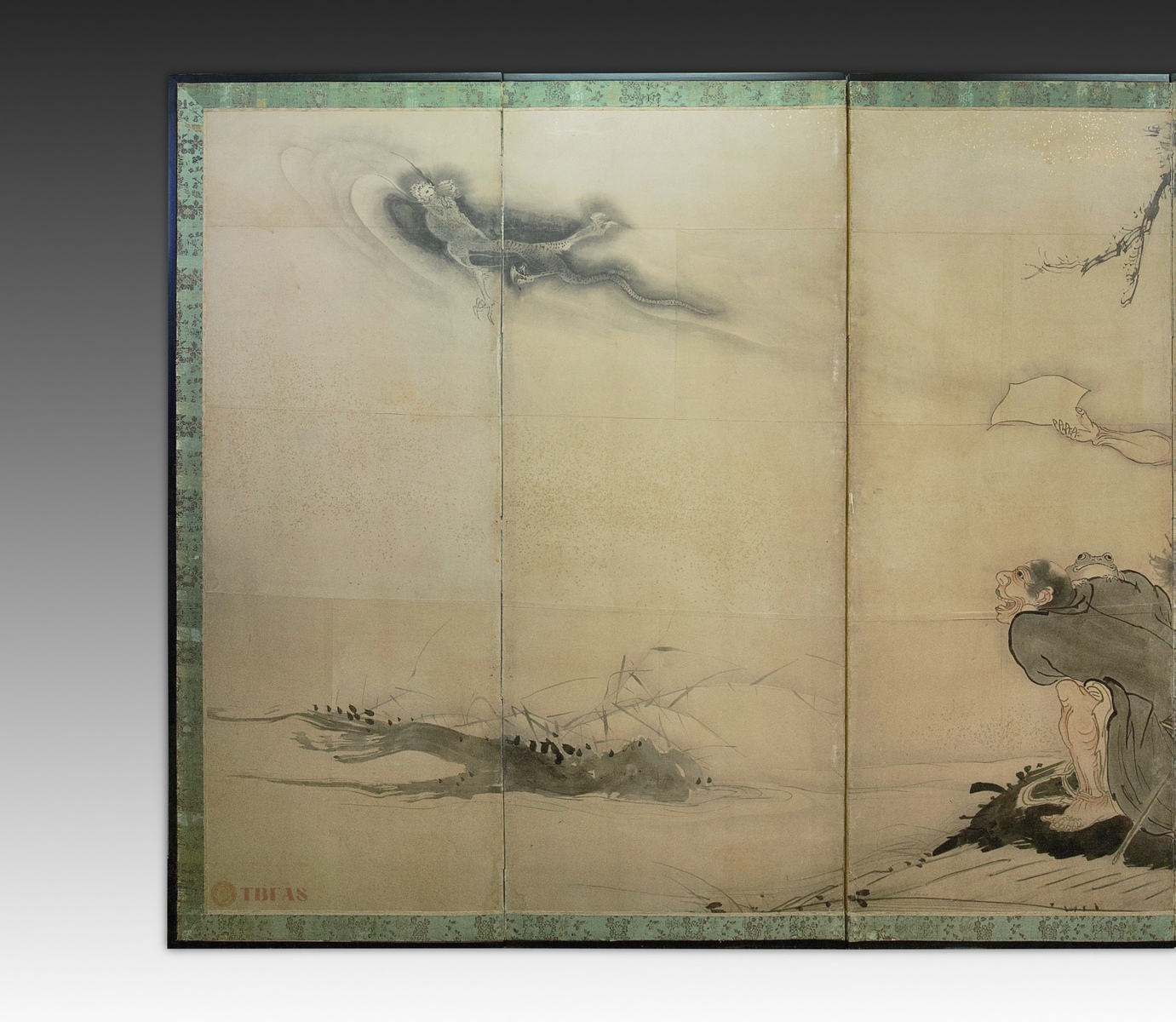 The Chinese mythology of the Xian is seen in Japan as a classic model for the Japanese paintings of Sennin. Sennin are holy men who live in harmony with nature, they are friends and companions of wild creatures because of their spiritual core of harmony with the universe. There is a book in the Edo Period that talks about five hundred sennin but for most people, there are eight that are popular and significant. In one of the screens, we see a sennin with his dragon rising into the heavens. The other sennin with various creatures, real and mythological, are shown in various poses created with the spontaneous and brilliant brushwork of Shohaku. The brushwork is similar to the flights of line and bursts of ink explosions, creating an expressive movement in negative space.