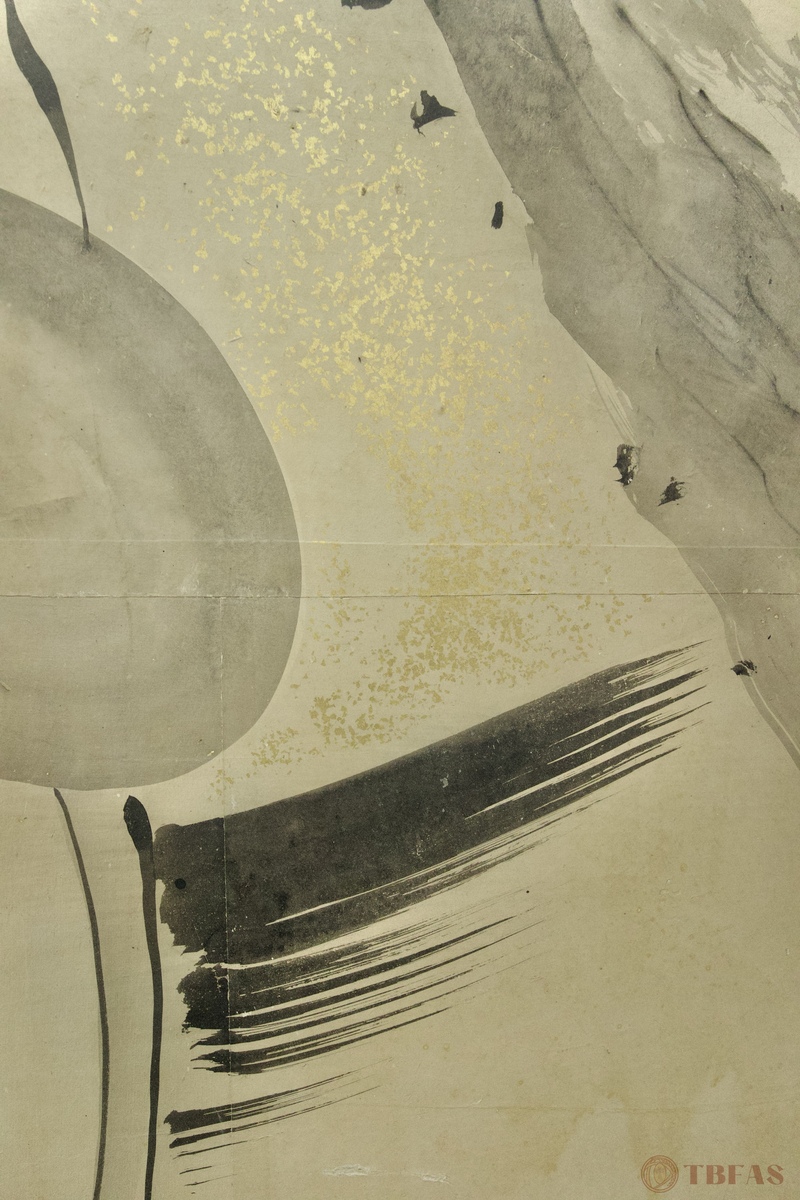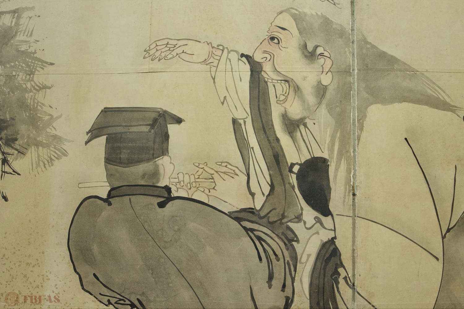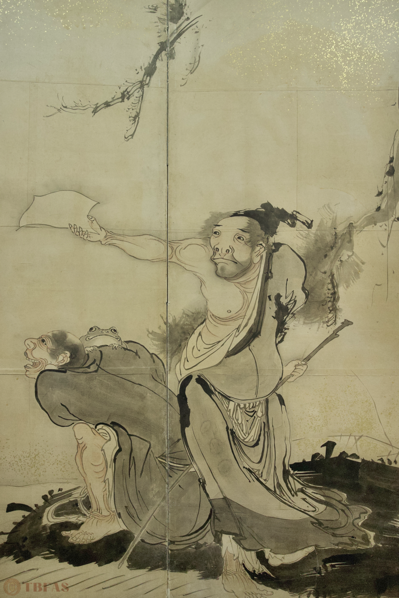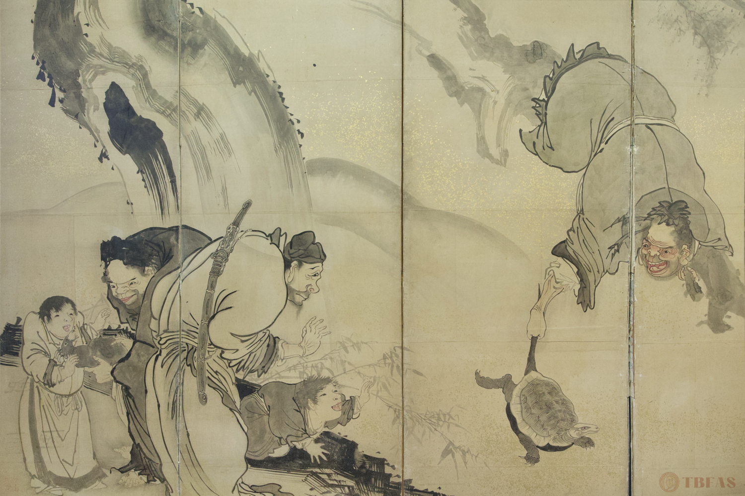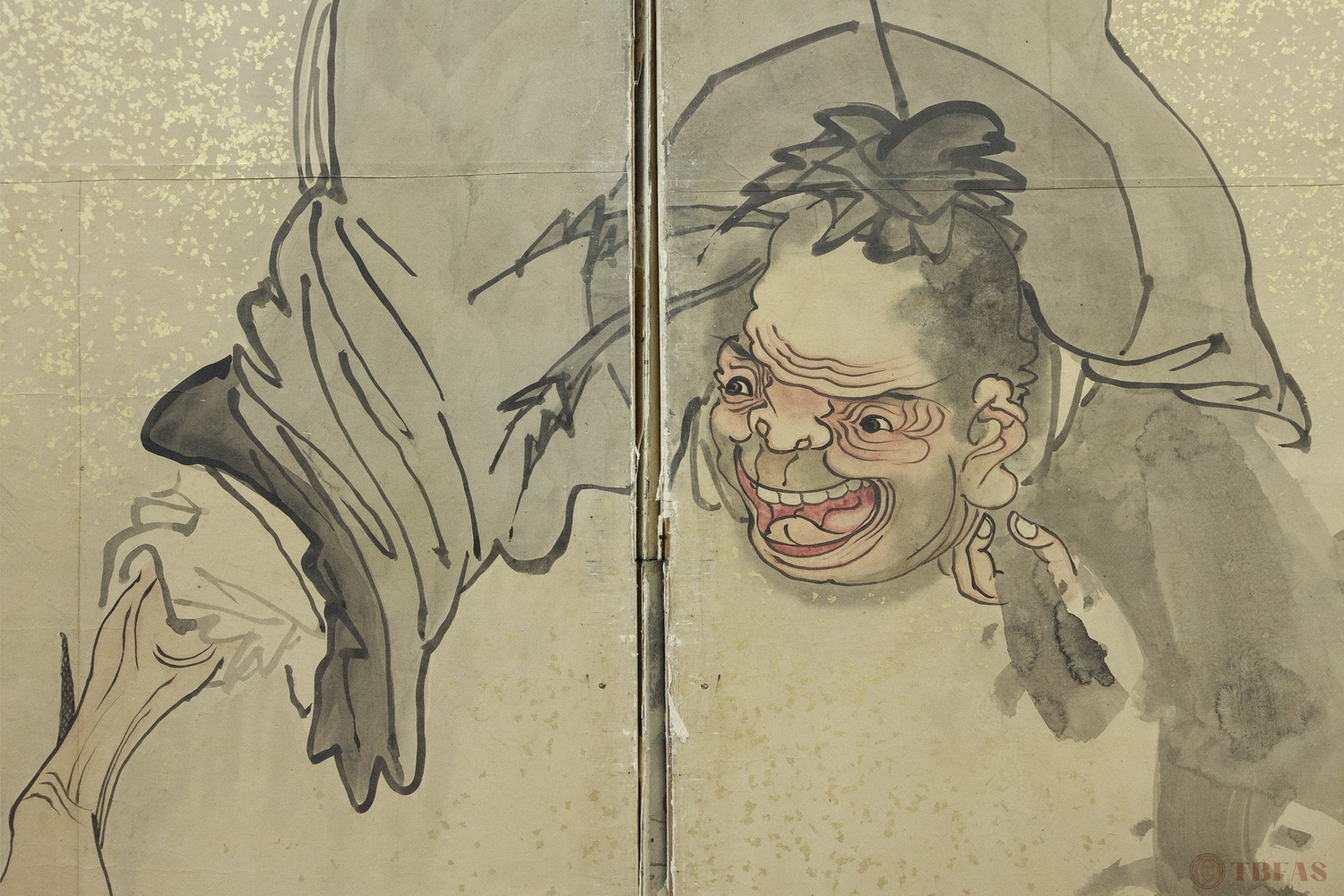 The Chinese mythology of the Xian is seen in Japan as a classic model for the Japanese paintings of Sennin. Sennin are holy men who live in harmony with nature, they are friends and companions of wild creatures because of their spiritual core of harmony with the universe. There is a book in the Edo Period that talks about five hundred sennin but for most people, there are eight that are popular and significant. In one of the screens, we see a sennin with his dragon rising into the heavens. The other sennin with various creatures, real and mythological, are shown in various poses created with the spontaneous and brilliant brushwork of Shohaku. The brushwork is similar to the flights of line and bursts of ink explosions, creating an expressive movement in negative space.