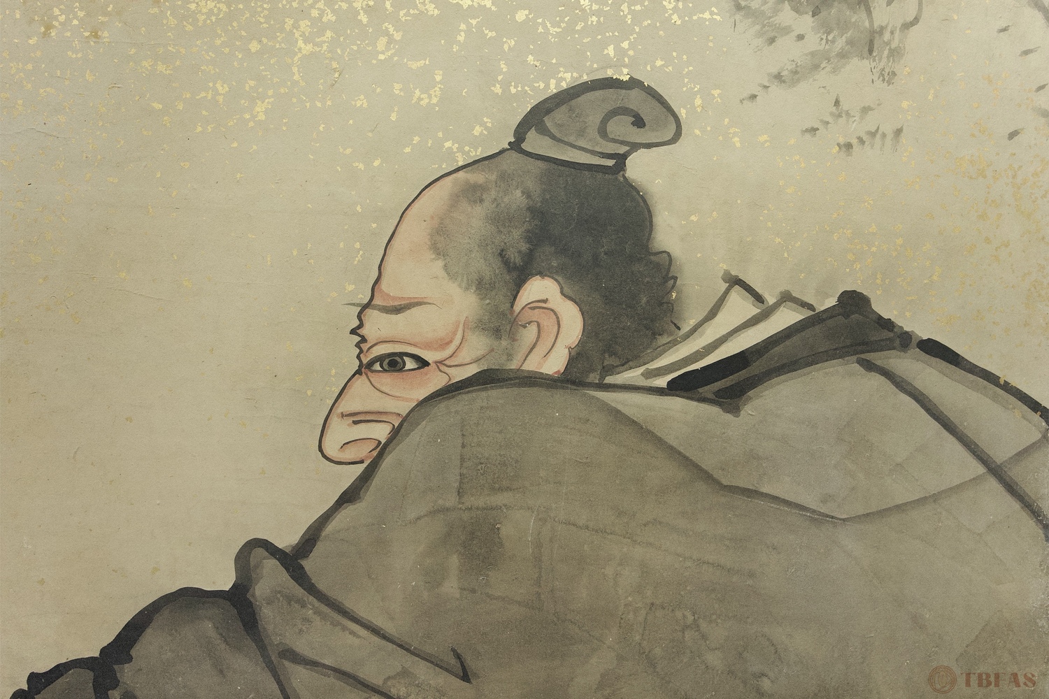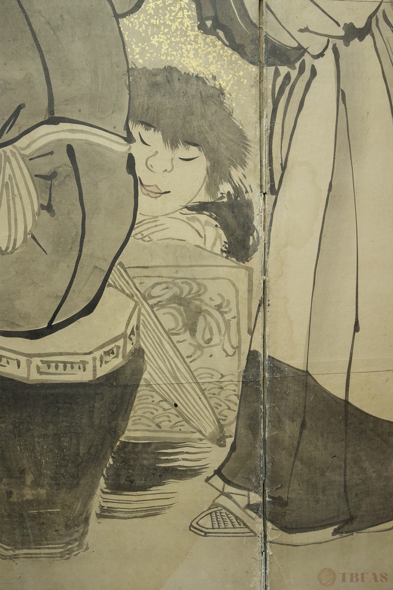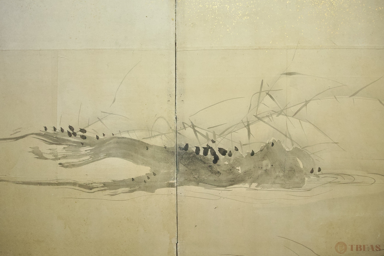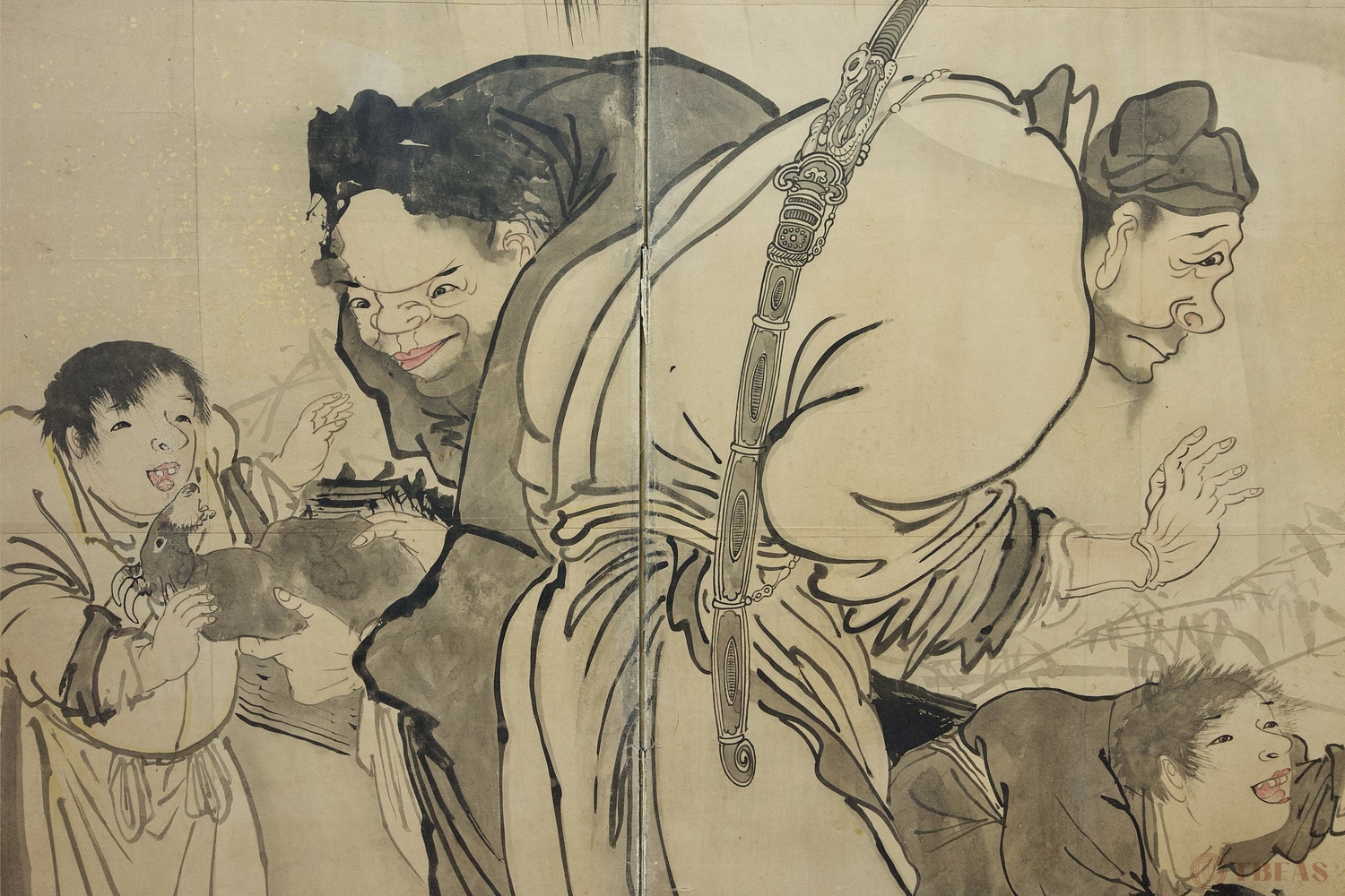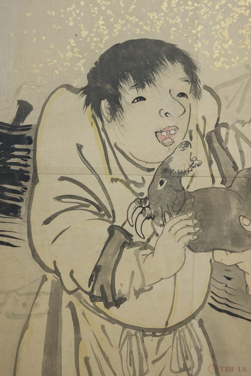 The Chinese mythology of the Xian is seen in Japan as a classic model for the Japanese paintings of Sennin. Sennin are holy men who live in harmony with nature, they are friends and companions of wild creatures because of their spiritual core of harmony with the universe. There is a book in the Edo Period that talks about five hundred sennin but for most people, there are eight that are popular and significant. In one of the screens, we see a sennin with his dragon rising into the heavens. The other sennin with various creatures, real and mythological, are shown in various poses created with the spontaneous and brilliant brushwork of Shohaku. The brushwork is similar to the flights of line and bursts of ink explosions, creating an expressive movement in negative space.