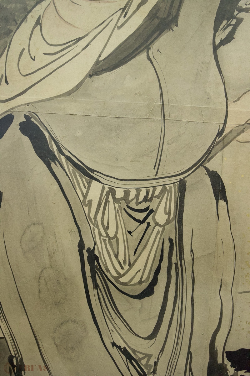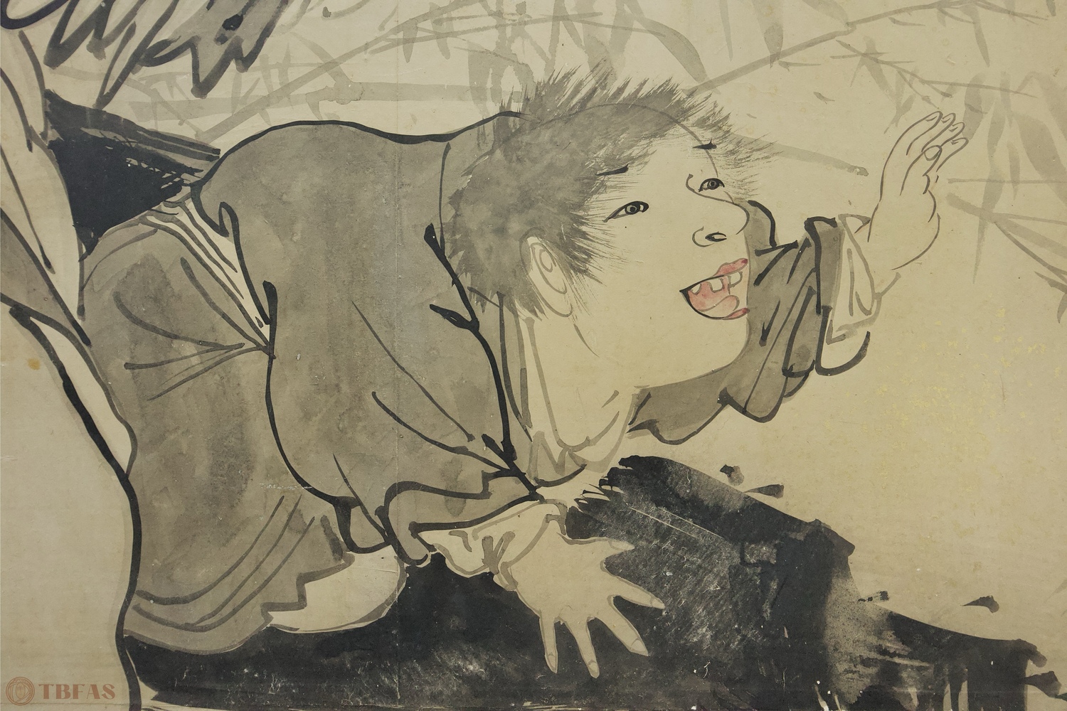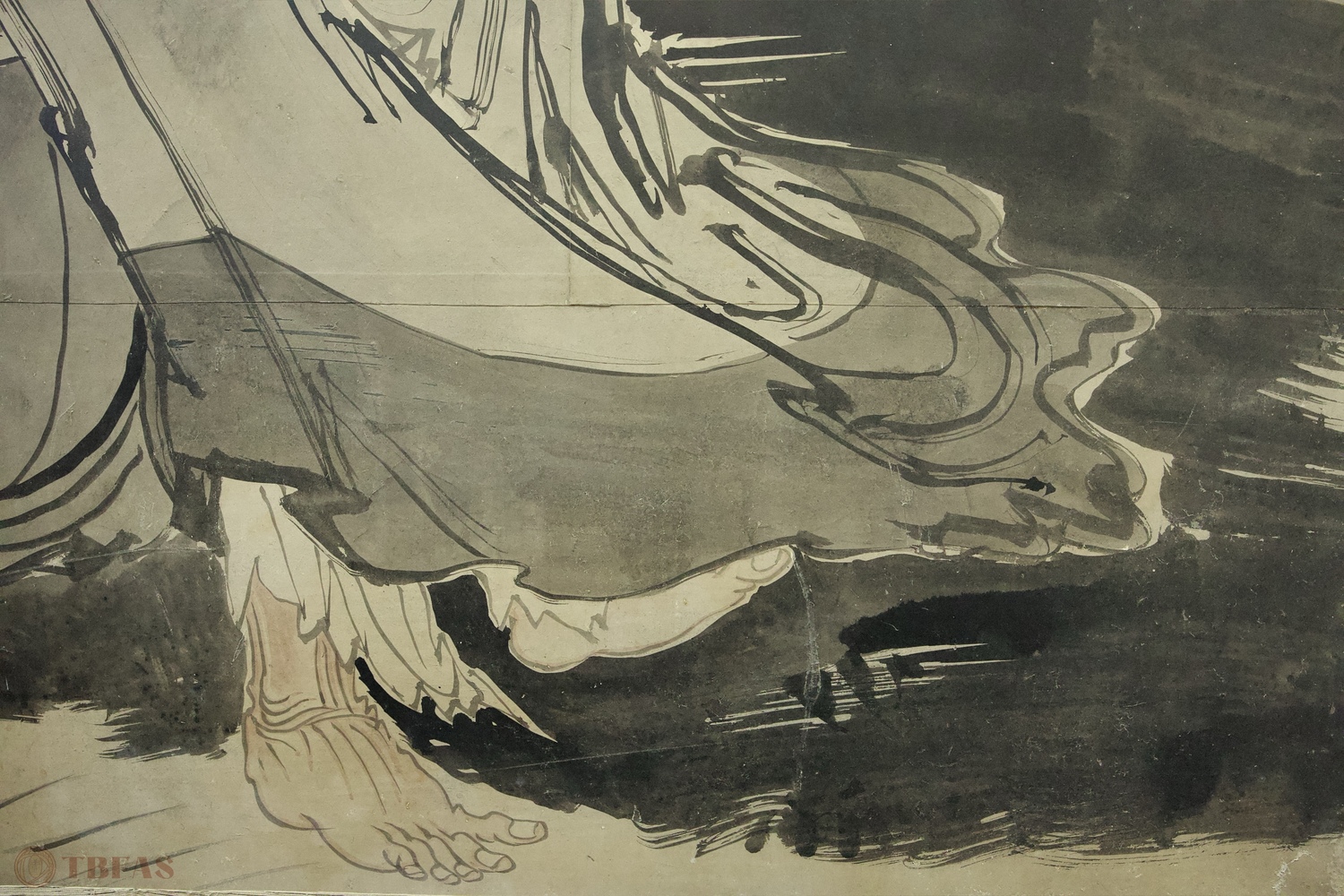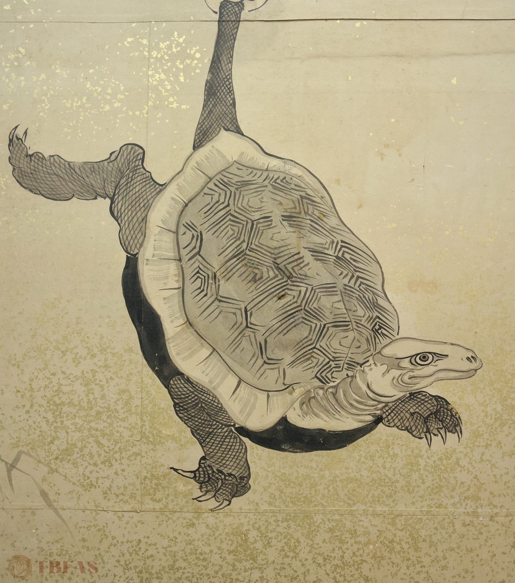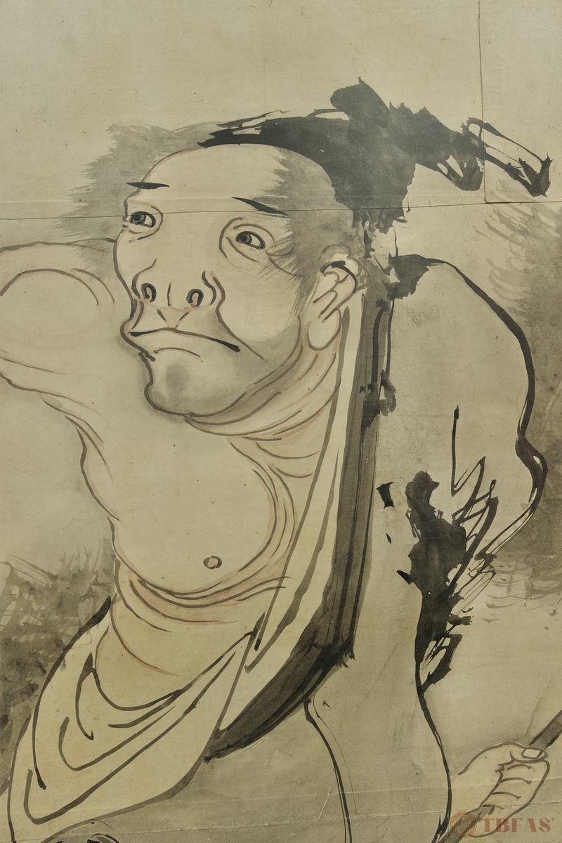 The Chinese mythology of the Xian is seen in Japan as a classic model for the Japanese paintings of Sennin. Sennin are holy men who live in harmony with nature, they are friends and companions of wild creatures because of their spiritual core of harmony with the universe. There is a book in the Edo Period that talks about five hundred sennin but for most people, there are eight that are popular and significant. In one of the screens, we see a sennin with his dragon rising into the heavens. The other sennin with various creatures, real and mythological, are shown in various poses created with the spontaneous and brilliant brushwork of Shohaku. The brushwork is similar to the flights of line and bursts of ink explosions, creating an expressive movement in negative space.