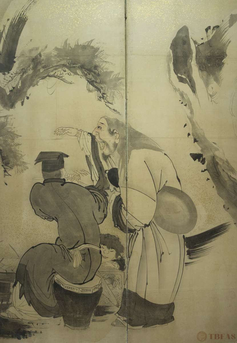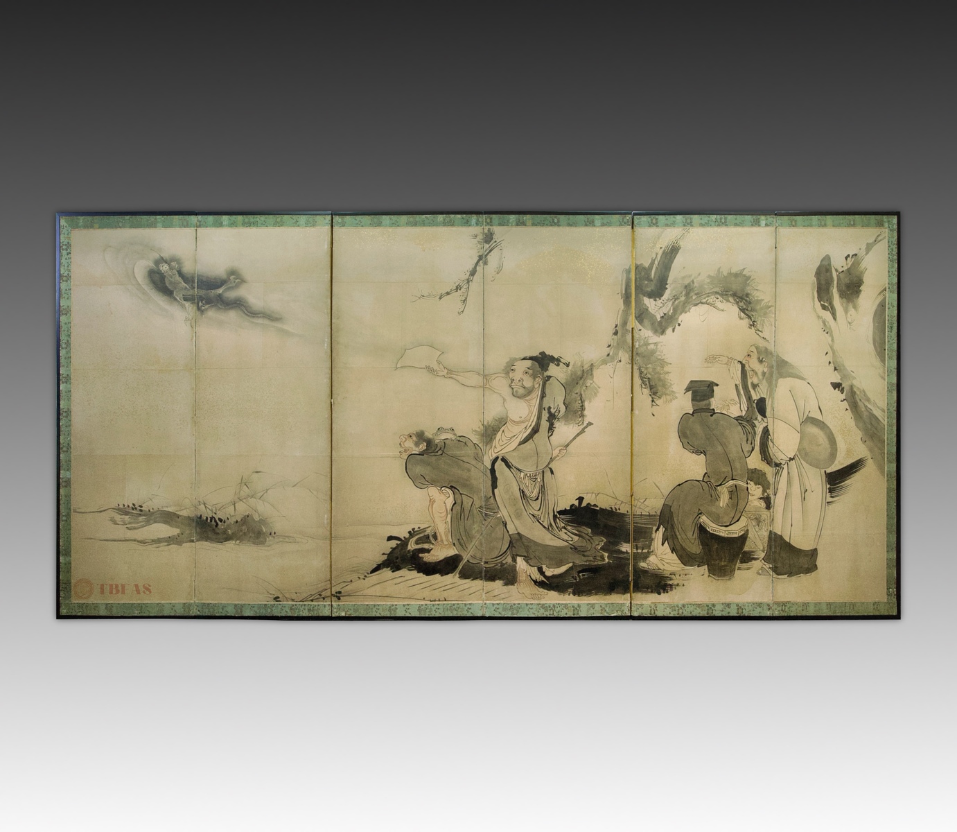 神仙的聚会。Soga Shohaku (曾我翔白)。江户(约1760)。水墨纸本屏风六摺一对。质良。作者是日本画史上的知名画家。作品收藏于京都国立博物馆、波士顿美术博物馆、印第安纳波利斯艺术博物馆和布鲁克林艺术博物馆等处。