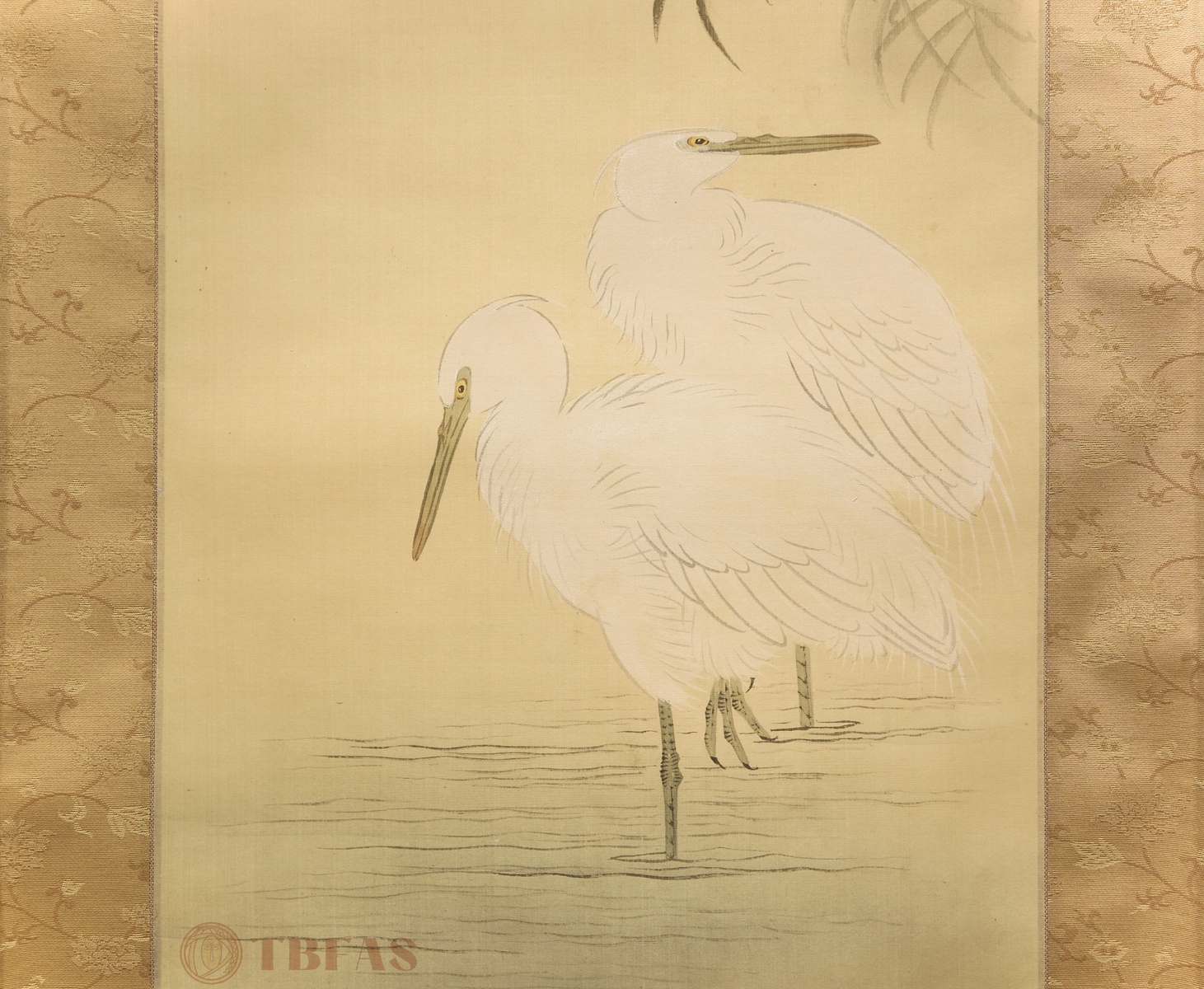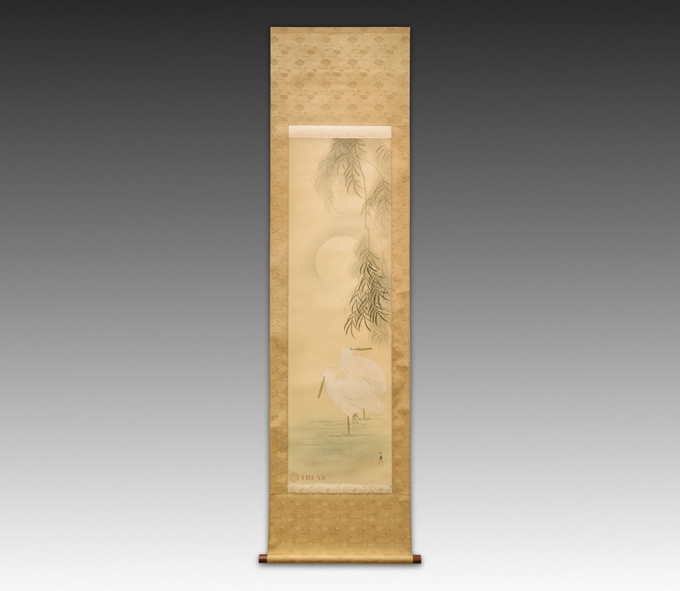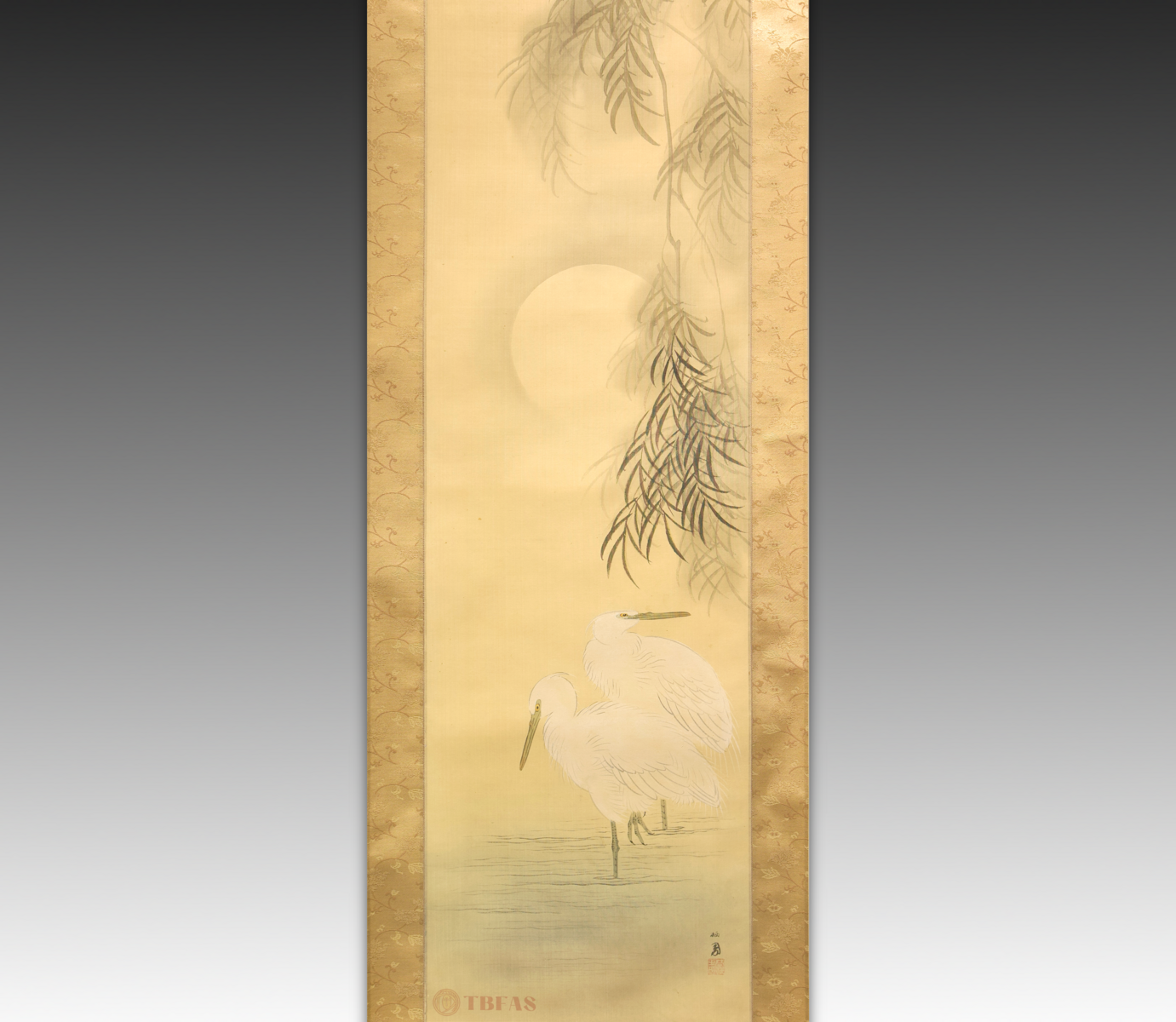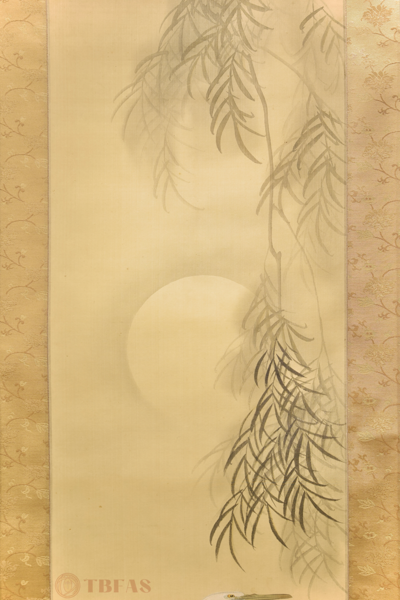 Takeuchi Seiho(1864-1942).2 herons standing in water under a willow in the moonlight. This is a Nihonga style painting done about 1910. It has the atmospheric character that was favored at that time. It also has some of the characteristics of lacquer ware paintings on inro and suzuribacko.