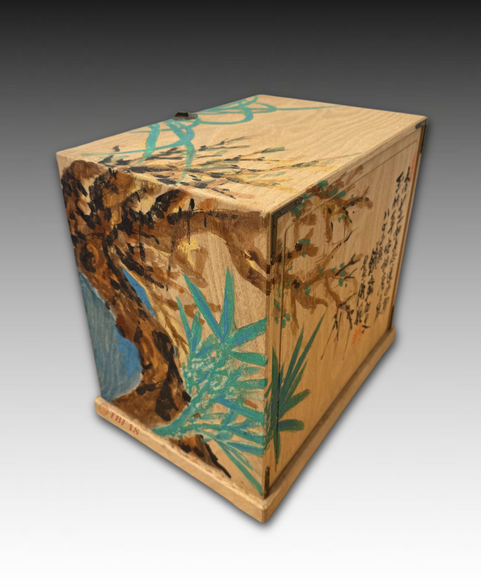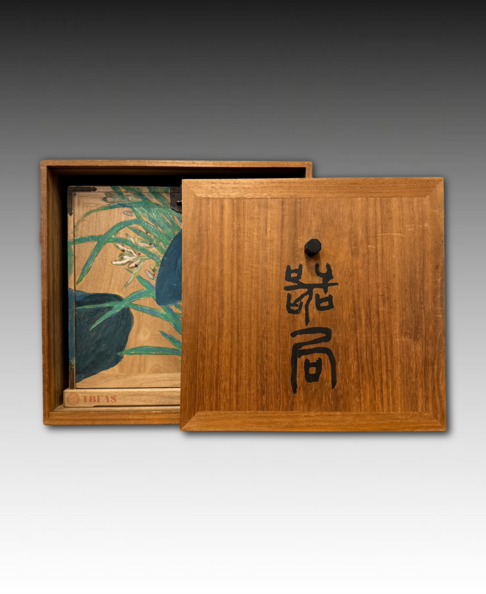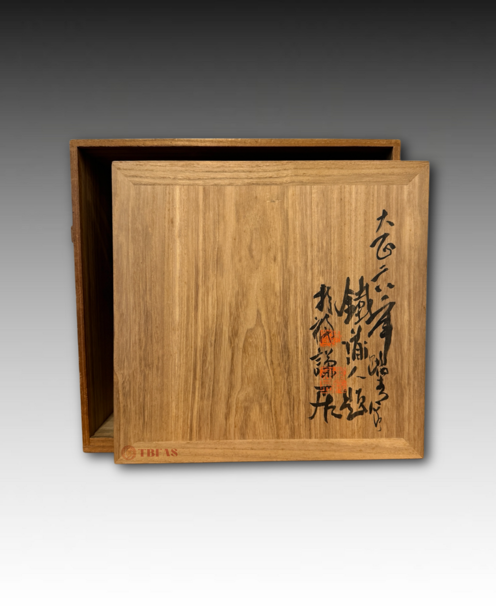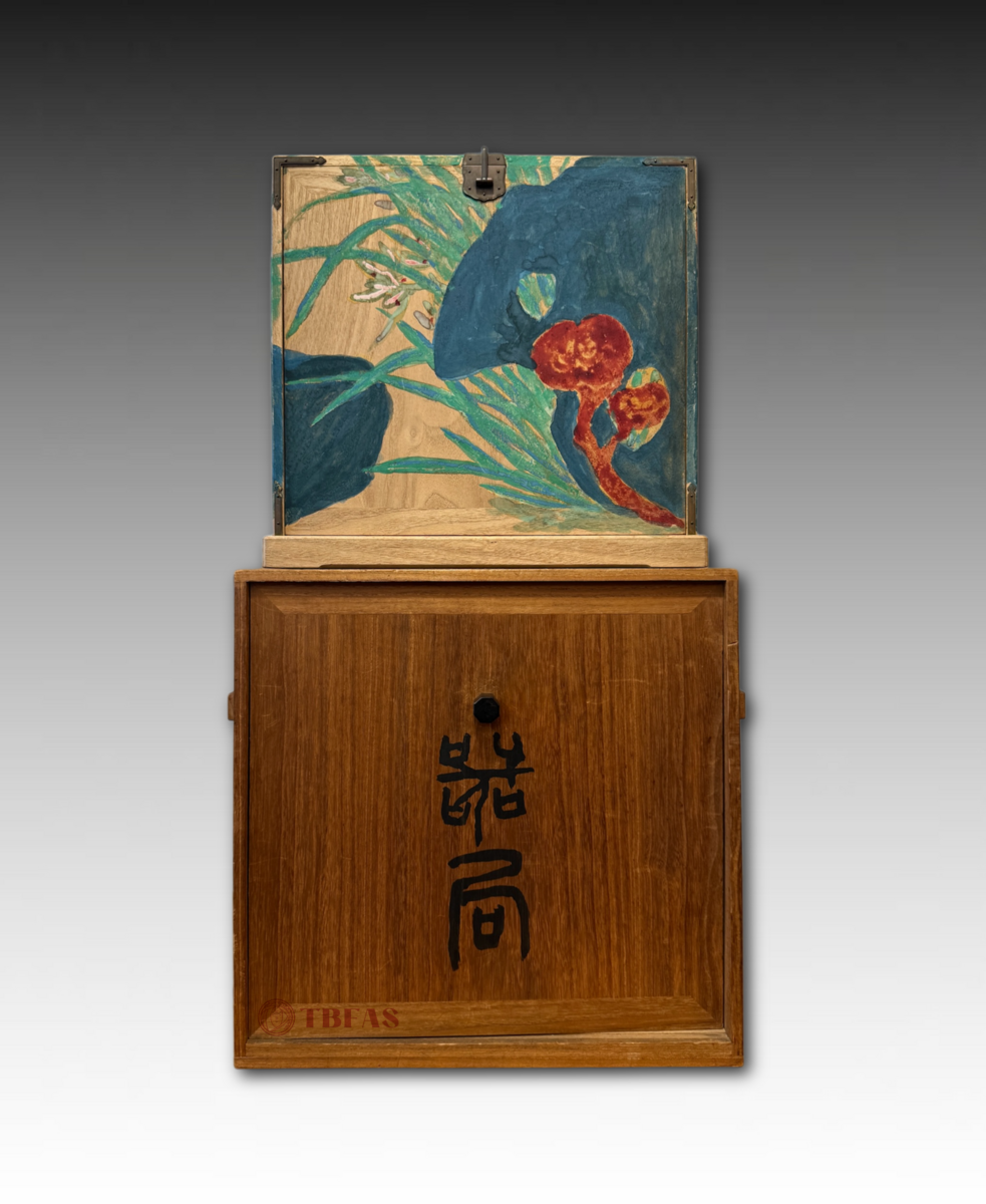“Kikyouku” is a Chinese accoutrements box for Chinese tea. Sencha developed in late Edo period, becoming popular. The Lingzhi fungus on the box is also a symbol or immortality. The box was painted by Tomioka Tessai at age 82.