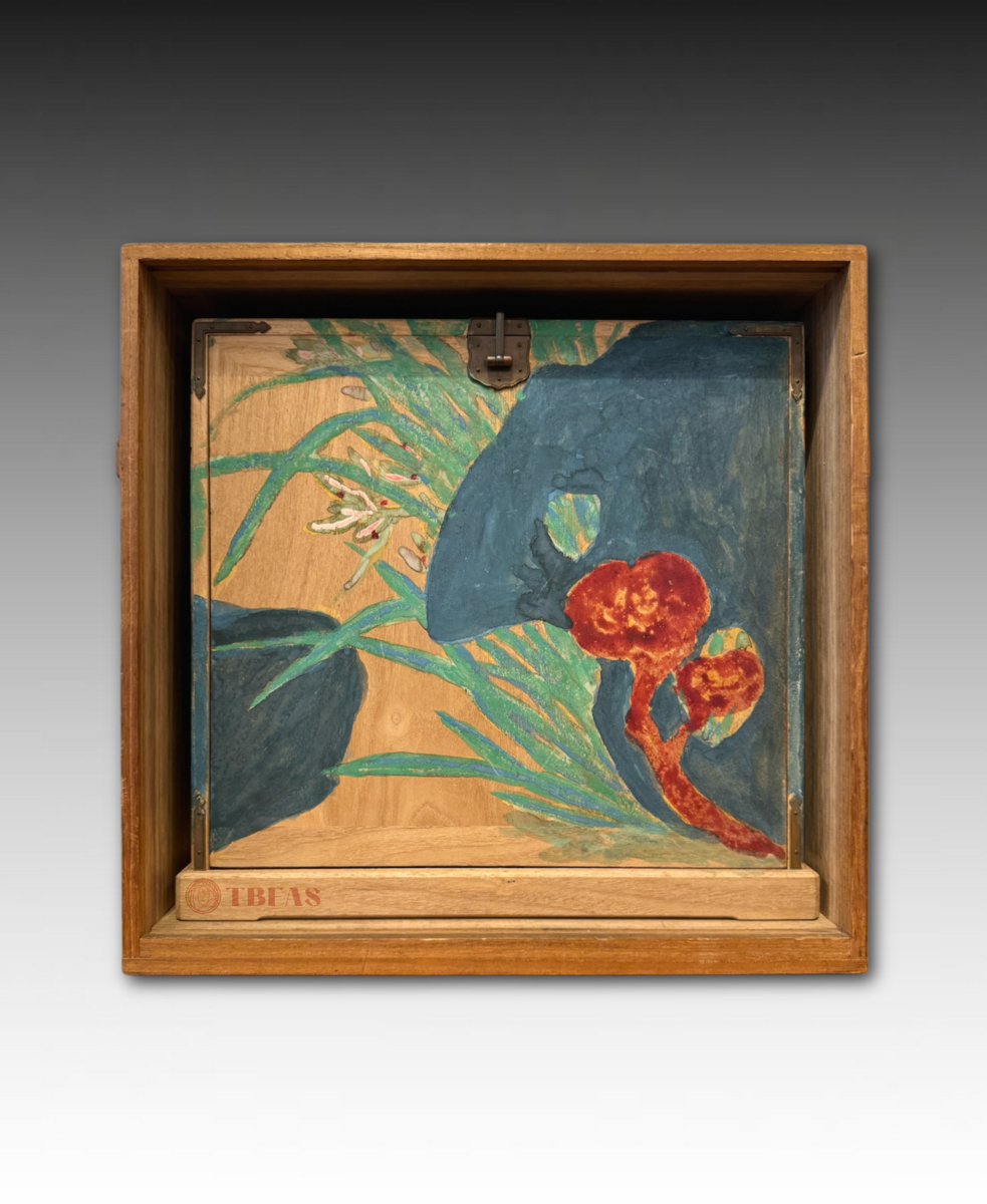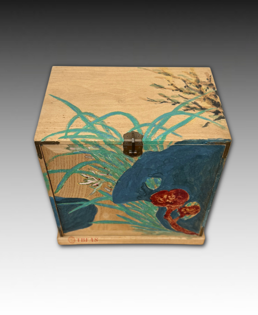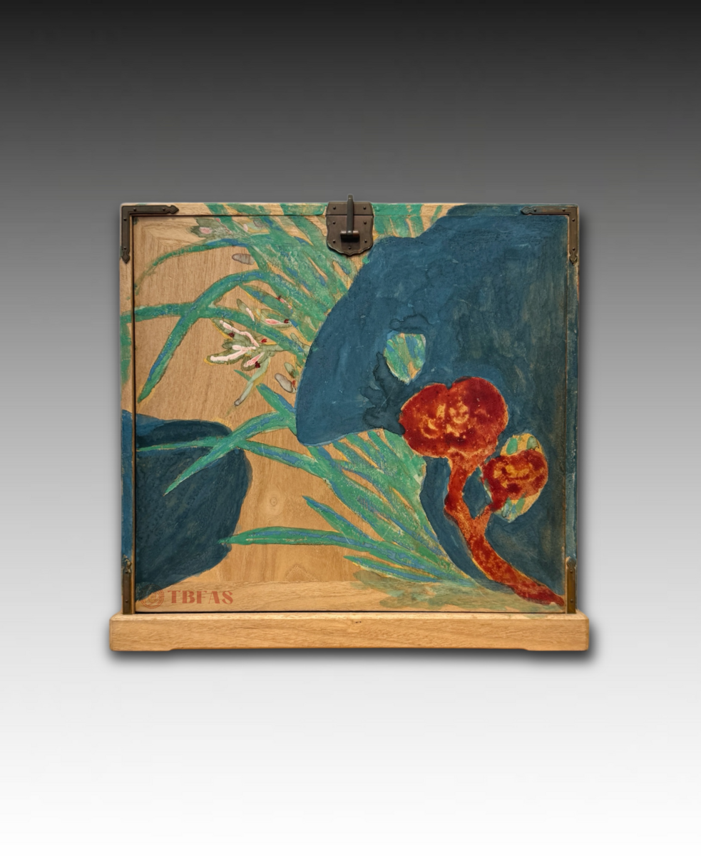 “Kikyouku” is a Chinese accoutrements box for Chinese tea. Sencha developed in late Edo period, becoming popular. The Lingzhi fungus on the box is also a symbol or immortality. The box was painted by Tomioka Tessai at age 82.