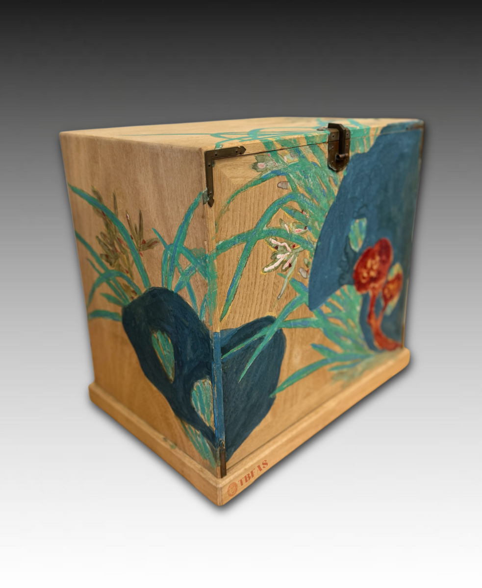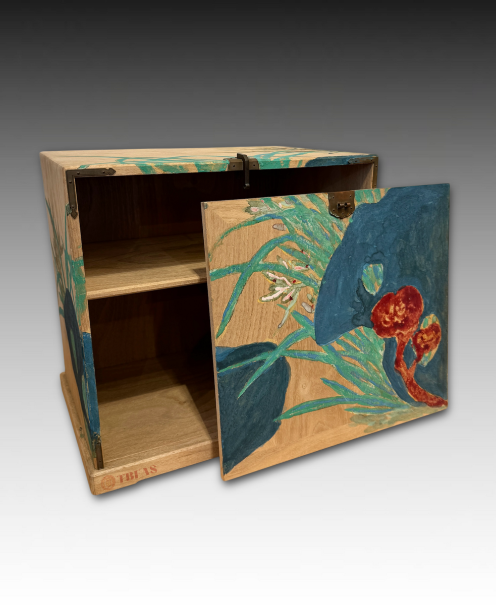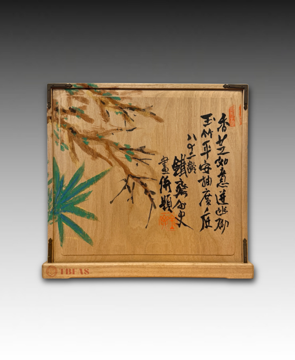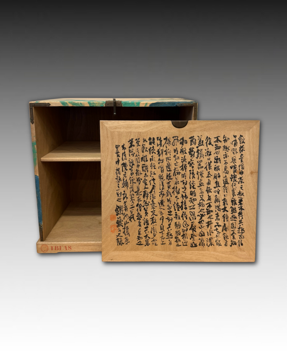 “Kikyouku” is a Chinese accoutrements box for Chinese tea. Sencha developed in late Edo period, becoming popular. The Lingzhi fungus on the box is also a symbol or immortality. The box was painted by Tomioka Tessai at age 82.