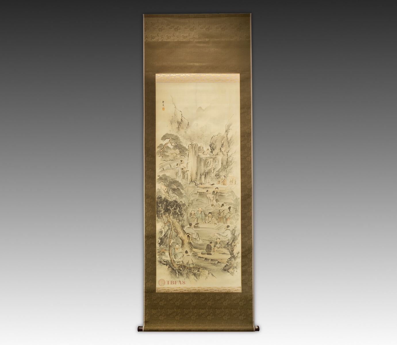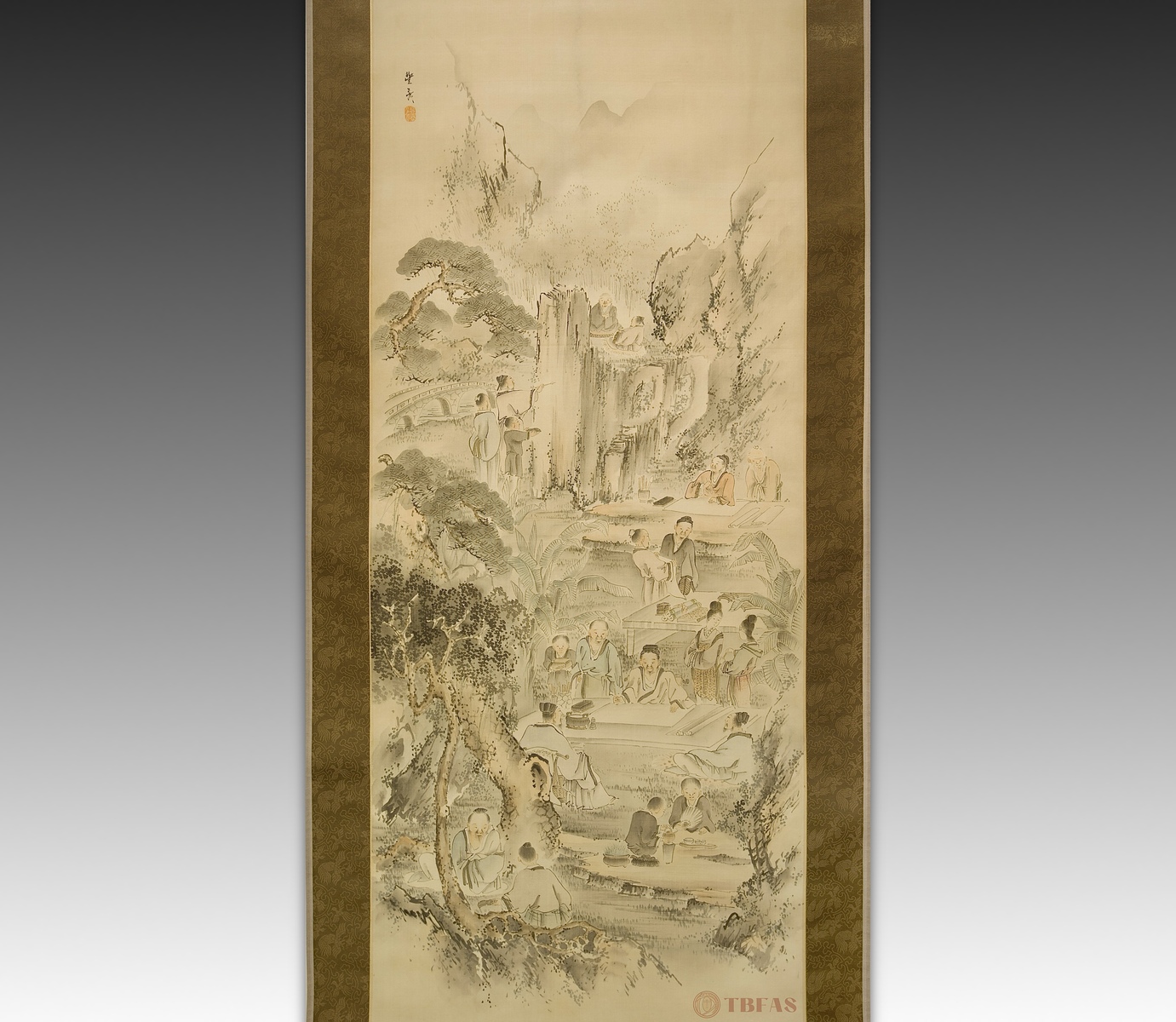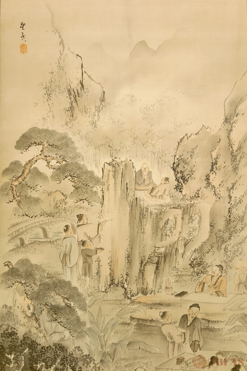 文人雅集图。岗本丰彦(1773 – 1845 ),江户。水墨设色绢本立轴。质优,重裱。作者是教师和艺术家,四条画派的主要成员。他的画深受中国画影响。