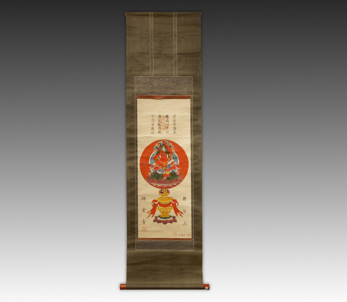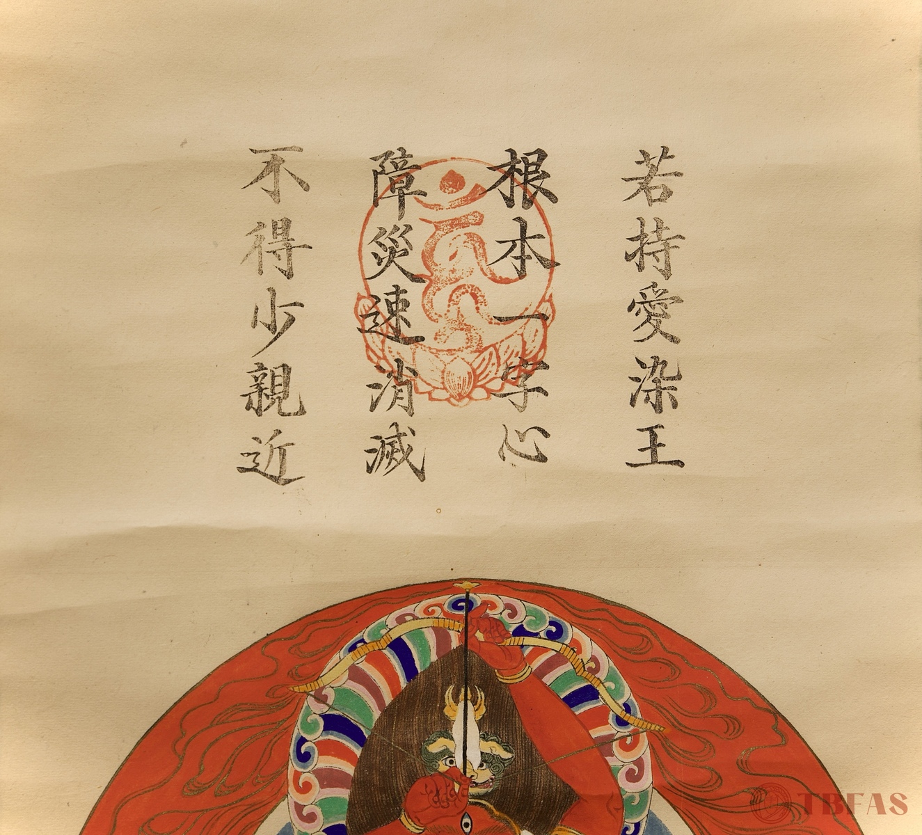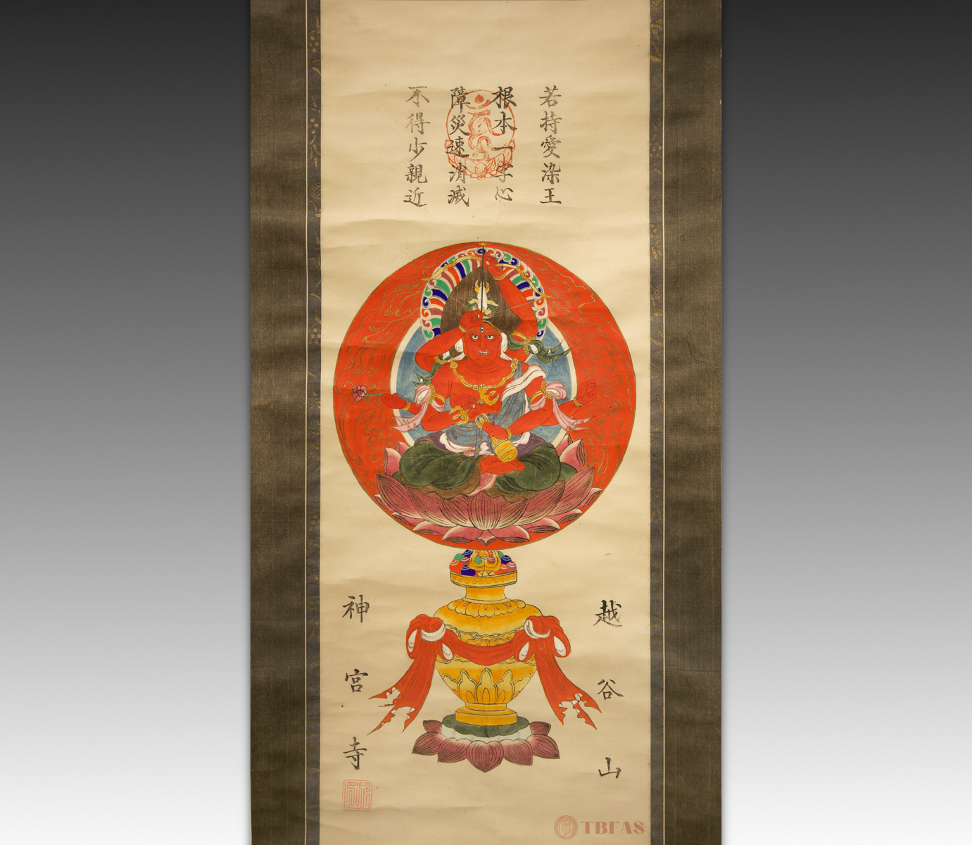 佛寺挂画。手绘印刷。质良。此画描绘了蓝染妙王(又称智慧之王蓝染),他将人的感情化为启蒙的载体。与此本尊有关的事迹主要记载于佛经金刚阁伊萨。