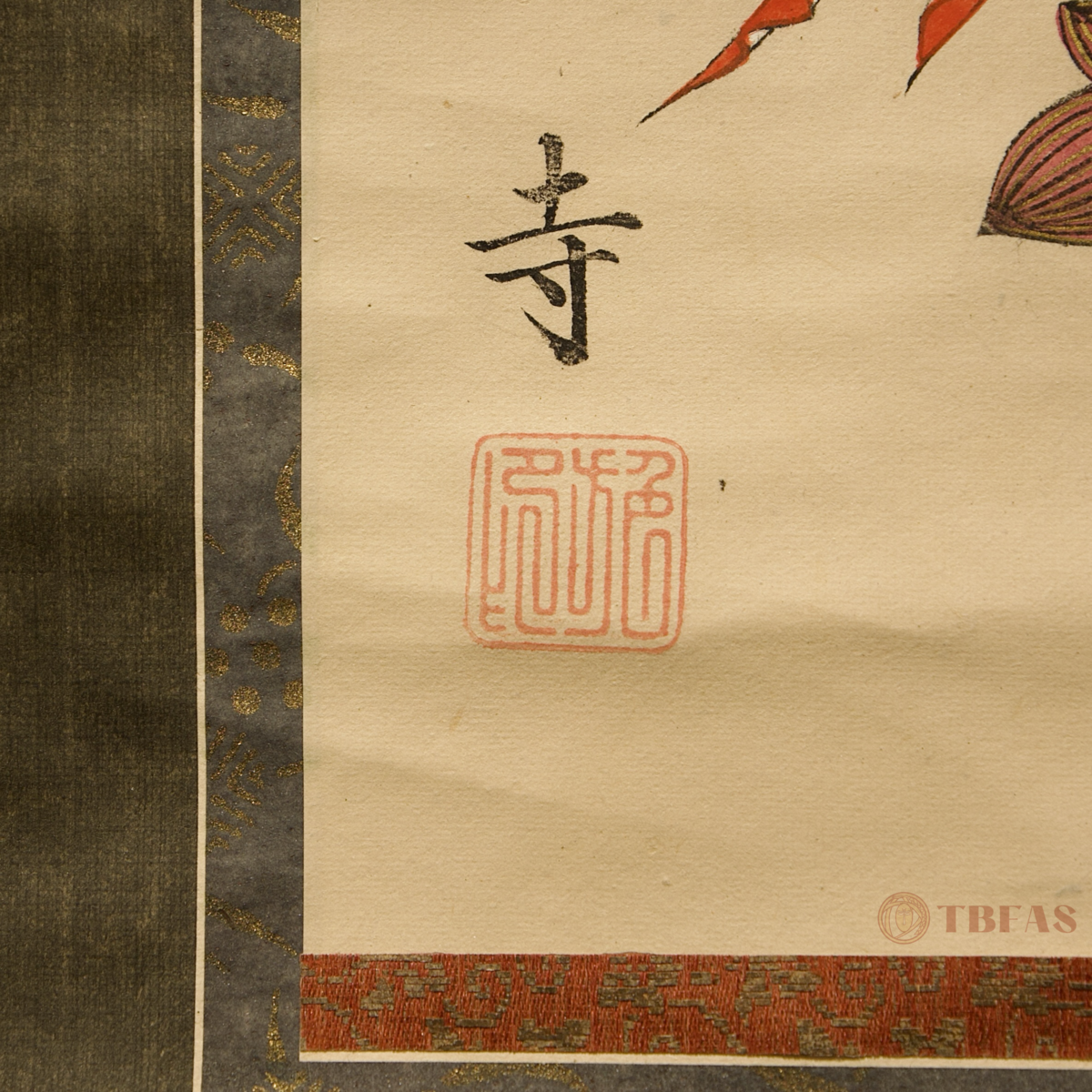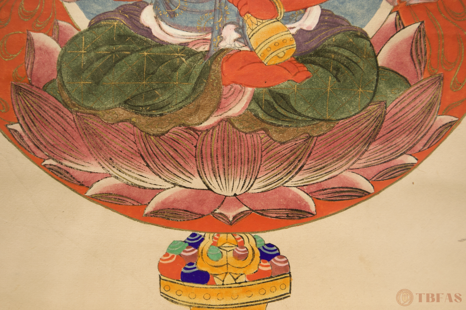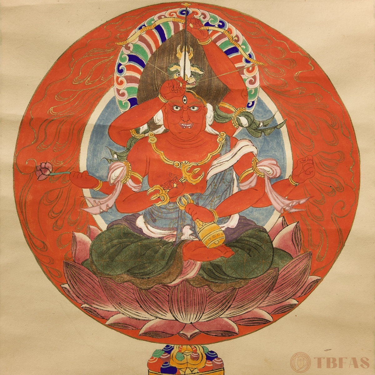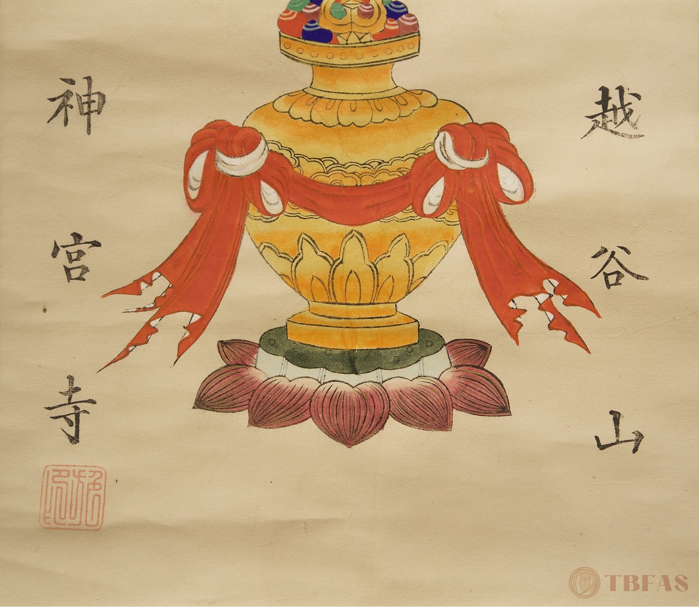 佛寺挂画。手绘印刷。质良。此画描绘了蓝染妙王(又称智慧之王蓝染),他将人的感情化为启蒙的载体。与此本尊有关的事迹主要记载于佛经金刚阁伊萨。