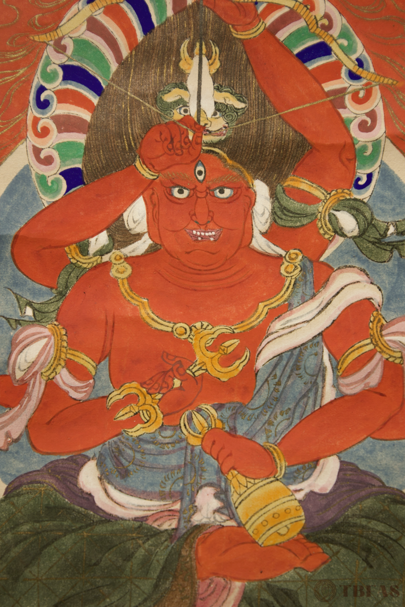 This painting depicts the Esoteric deity Aizen Myo-o, or ‘Aizen the Wisdom King’. His function is to transform human passions into a vehicle for Enlightenment. The primary sutra related to this deity is the Kongoburokaku Issai Ygaya Gikyo. This text was translated into Chinese in the early eighth century by the Indian monk Vajrabodhi. Worship of Aizen Myo-o was introduced into Japan by Kobo Daishi in the early ninth century. From the Late Heian period onward, Aizen was invoked to aid in emotional problems as well as to protect the state.