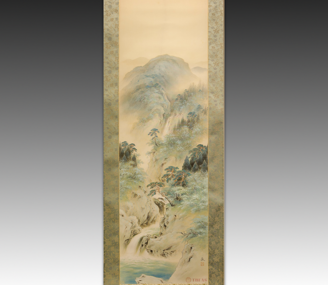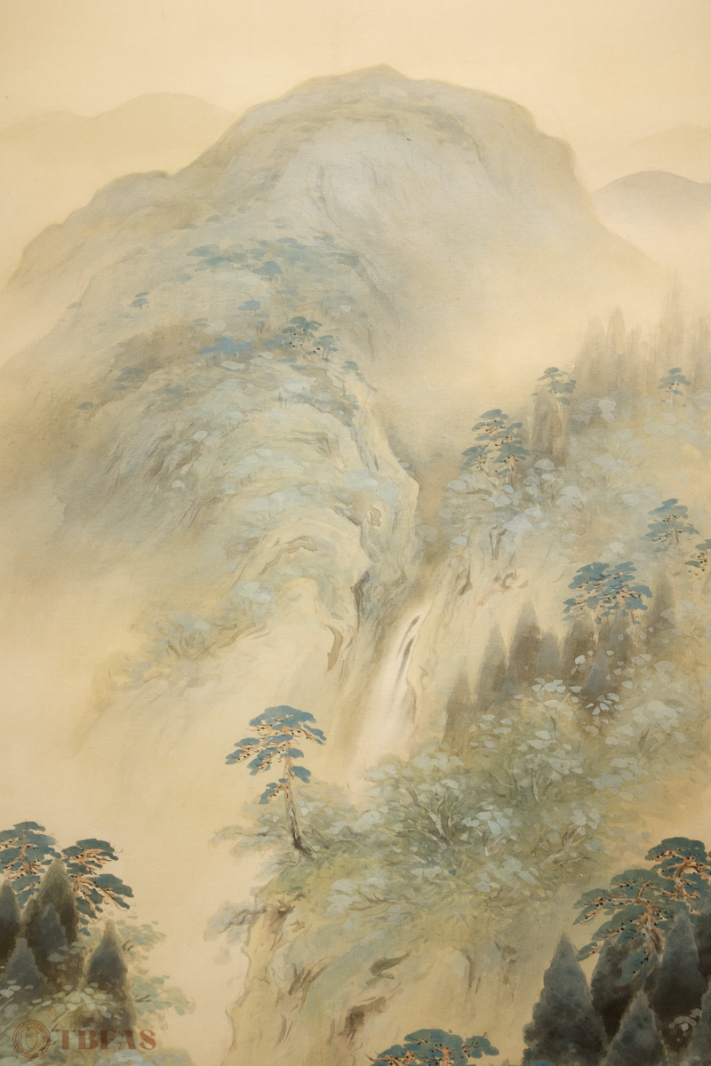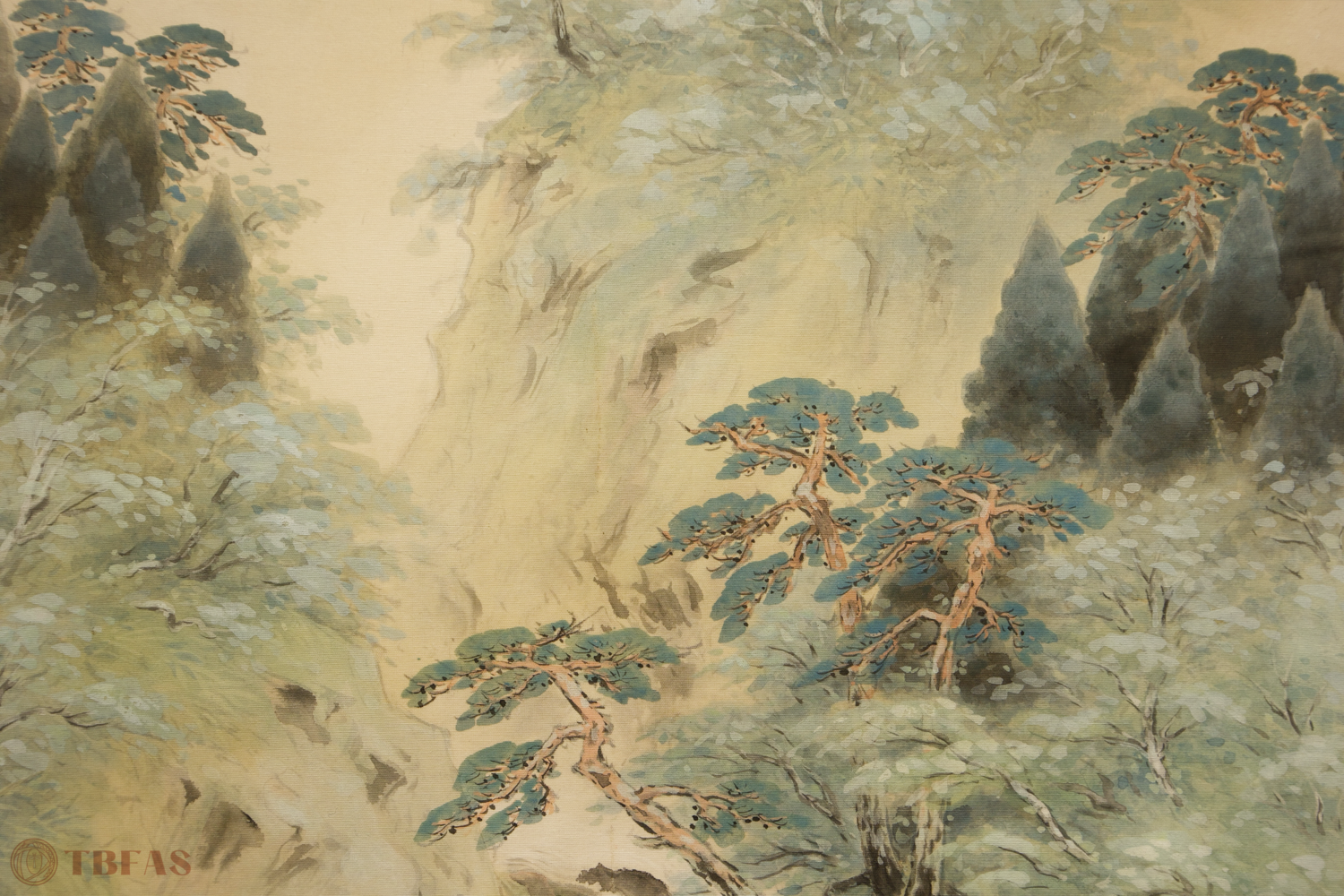 山水。昭和初(1926)。设色绢本立轴。质优,重裱。此画遵循日本传统绘画的散点透视,用色鲜艳明亮,可以看出同时受日本新杭家传统和欧洲绘画的影响。