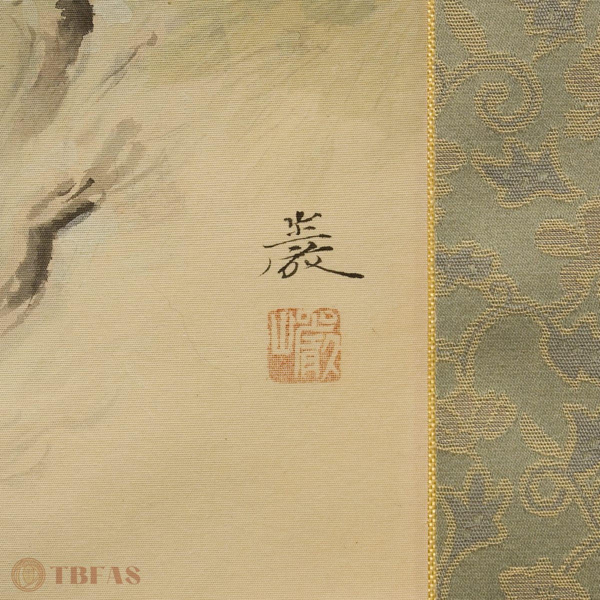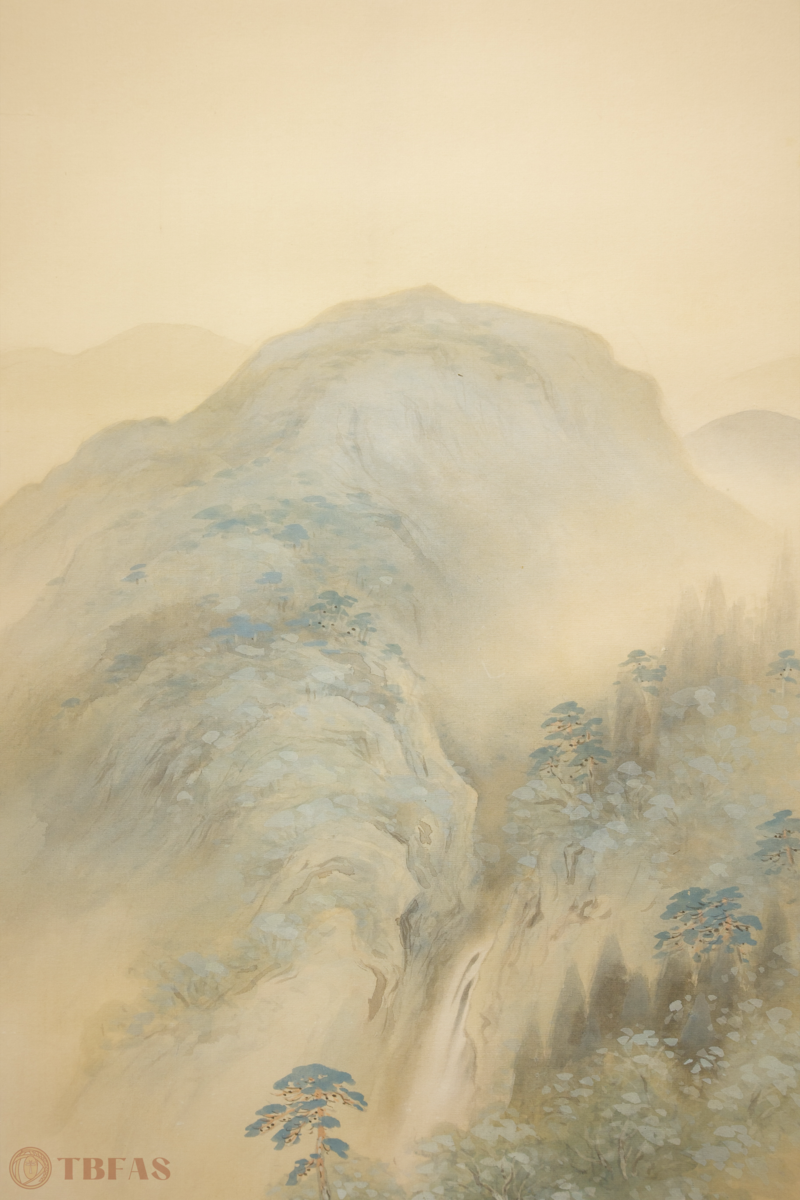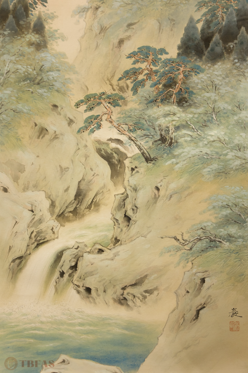山水。昭和初(1926)。设色绢本立轴。质优,重裱。此画遵循日本传统绘画的散点透视,用色鲜艳明亮,可以看出同时受日本新杭家传统和欧洲绘画的影响。