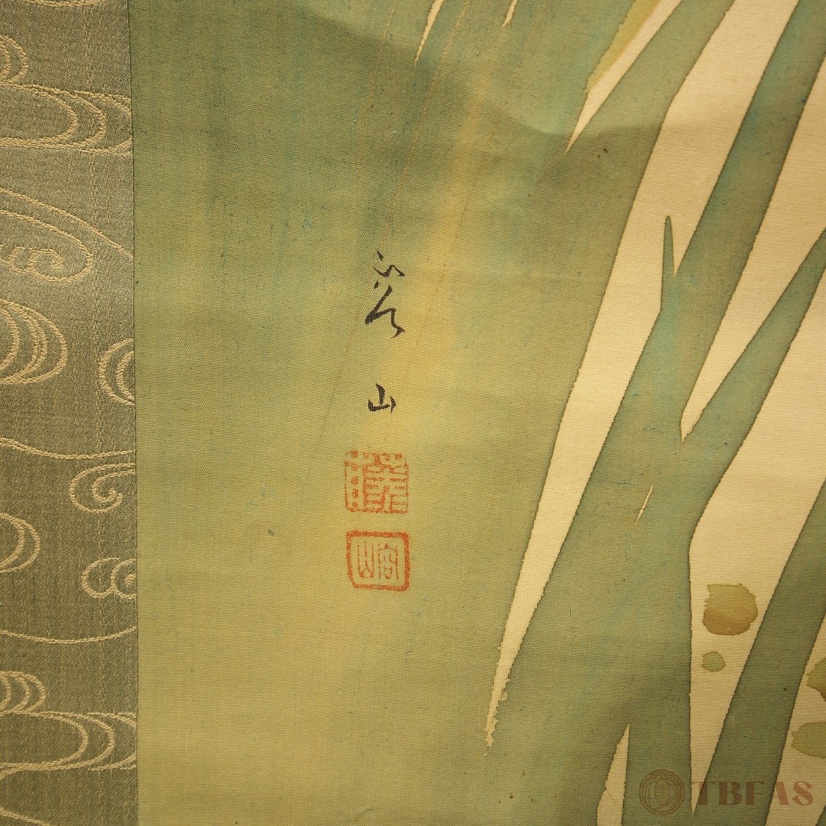 Japanese painting on silk of a koi leaping out of a pond that is bordered by irises.