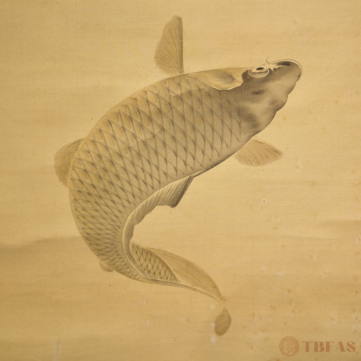 鲤鱼。昭和初(1926 – 1989)。设色绢本立轴。质优。