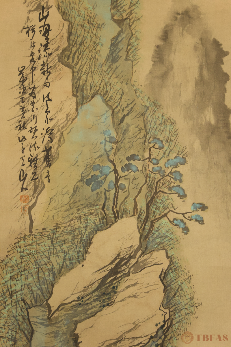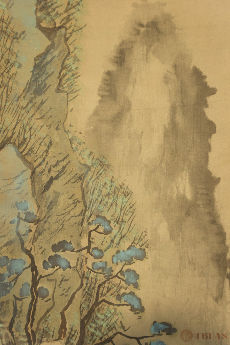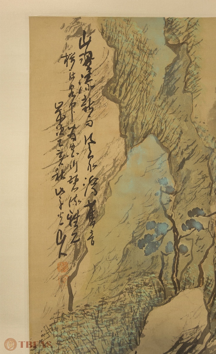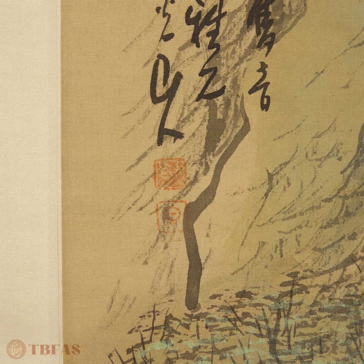 山水。江户 – 明治(19世纪)。水墨设色绢本立轴哦。品相优。