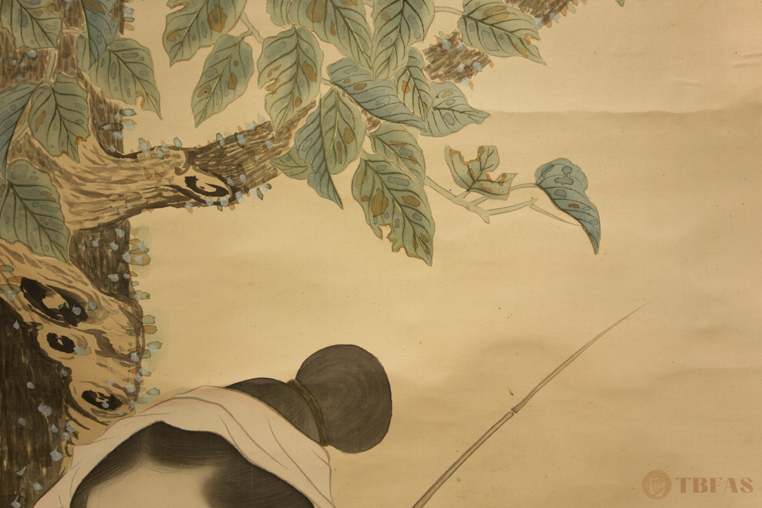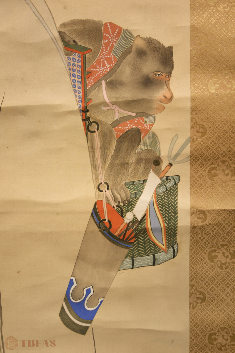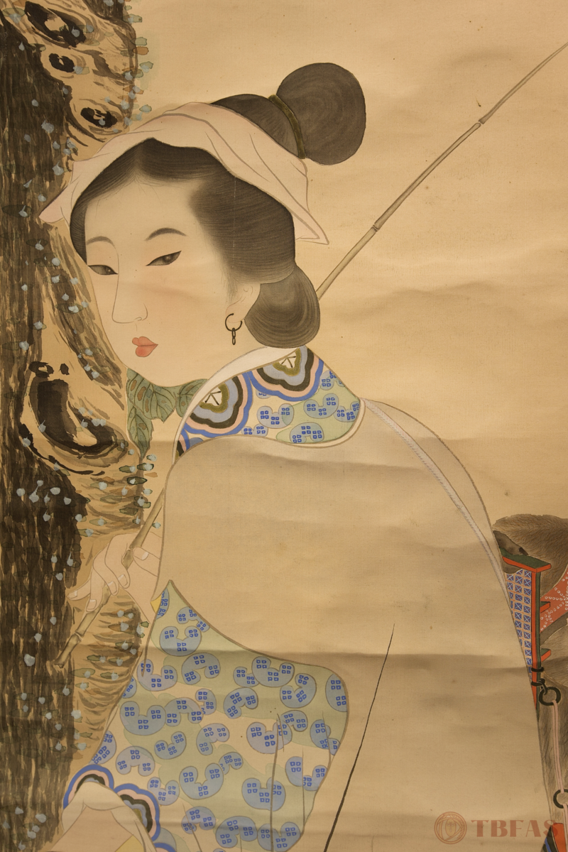 驯猴的女人。大正 – 昭和。设色绢本立轴。品相优轻微虫蛀。