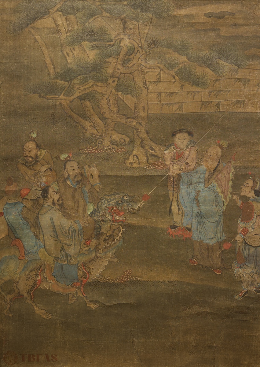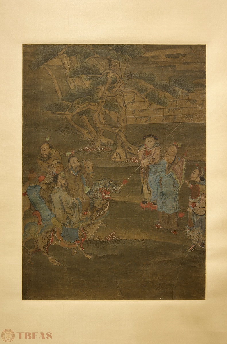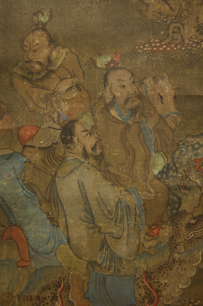 In this scroll, we see the white-haired General of the Zhou on the right confronting the General of the Shang on the left before battle.