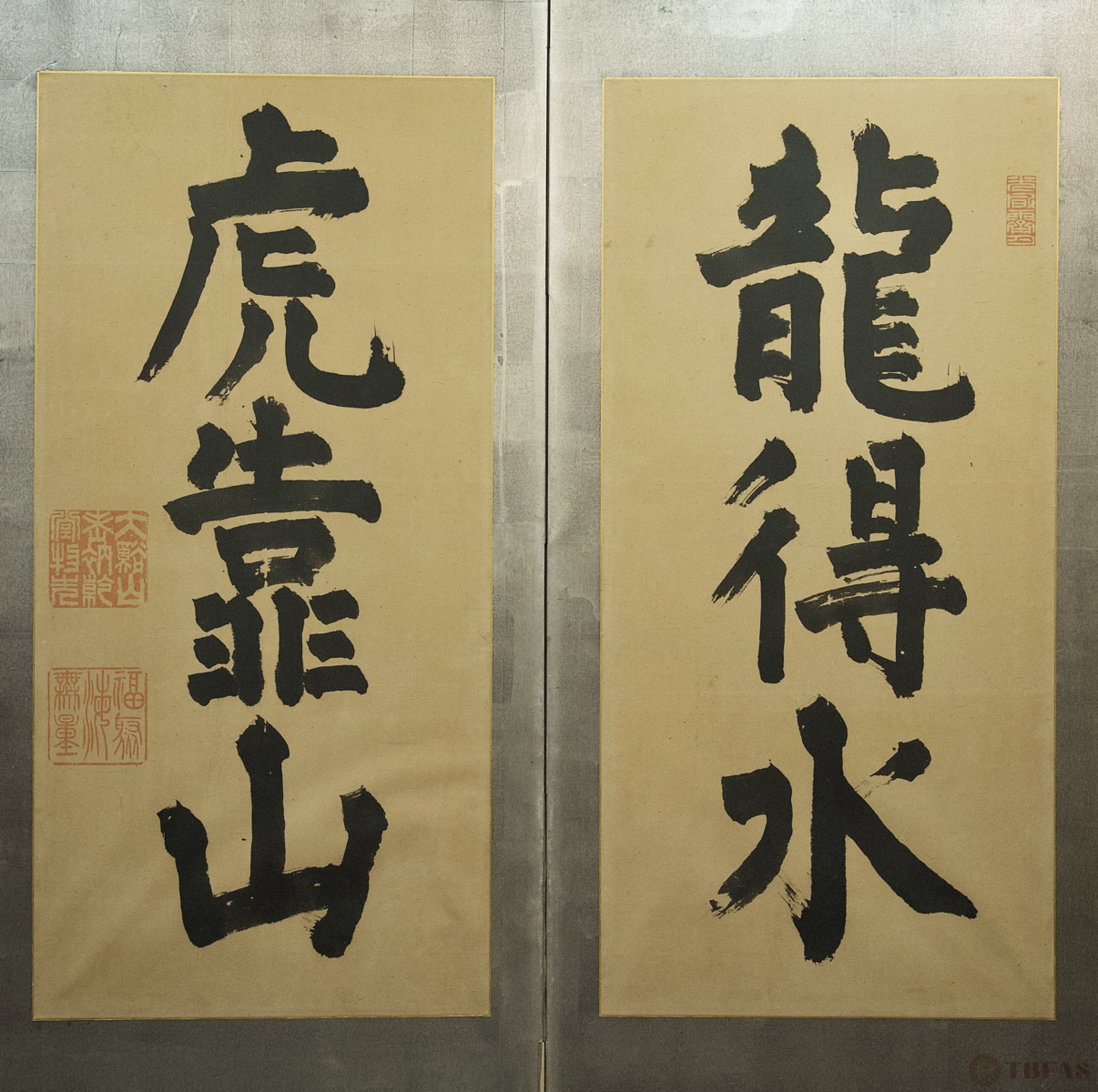 The left panel reads, ‘Tiger in the Mountains’. The right panel reads, ‘Dragon over Waves’. The tiger is a symbol of strength and dragons are symbols of righteousness and benevolent leadership.