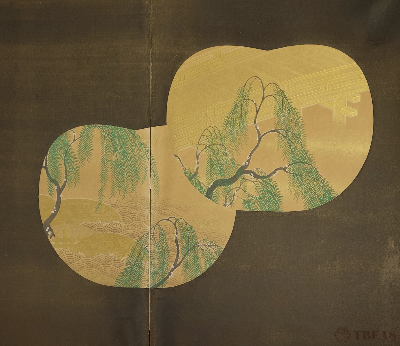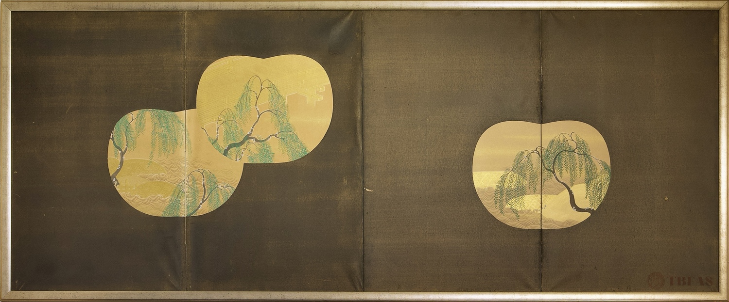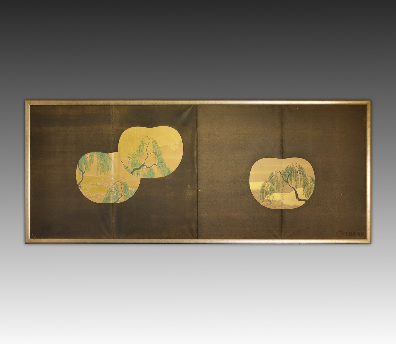 垂柳四摺屏风。明治(19世纪末)。矿物颜料纸本。状况良好。