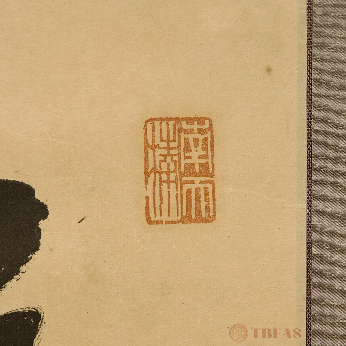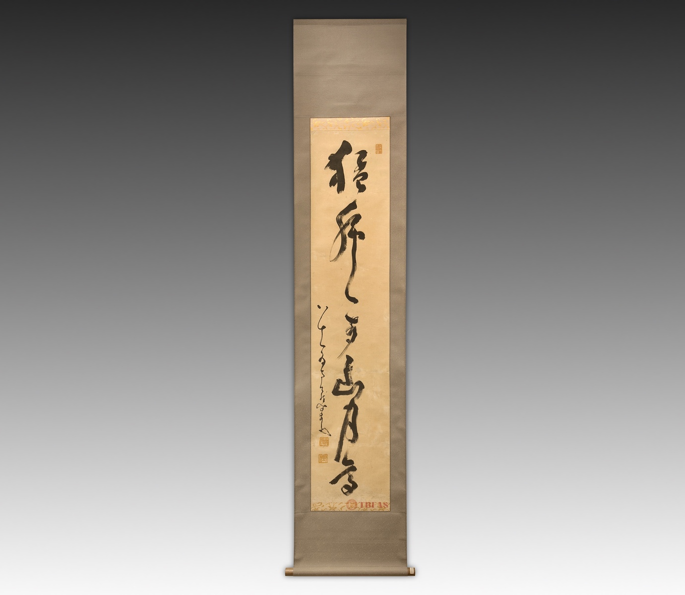 One line calligraphy. A ‘tiger’s roar’ symbolizes the dynamic teaching of Zen, teaching that proclaims the unity of Buddha and nature. The ‘moon high above the mountains’ represents the mind of enlightenment that illuminates the entire world. The brushstrokes here are rich and lucid.