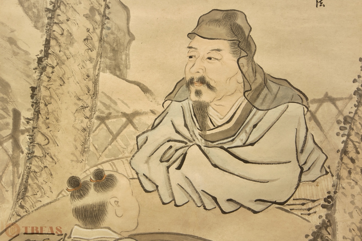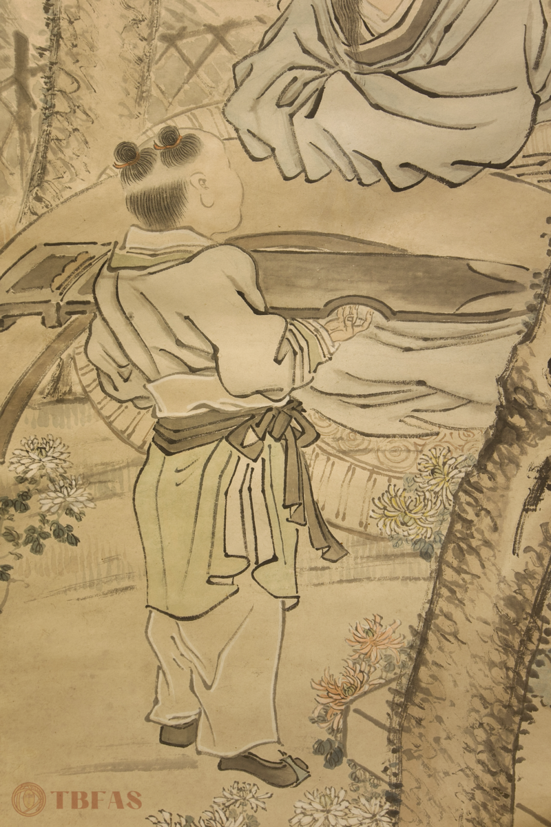 Tao Yuanming, also known as Tao Qian was a Chinese poet of the Six Dynasties poetic period (ca. 220 – 589 CE). Generally regarded as the greatest poet during the centuries between the Han and Tang dynasties. He was famous for playing the qin without strings. In this painting we see an attendant bringing this qin to him. He also looks longingly into the distance, perhaps waiting for his delivery of wine (which is also part of the famous legend about him).