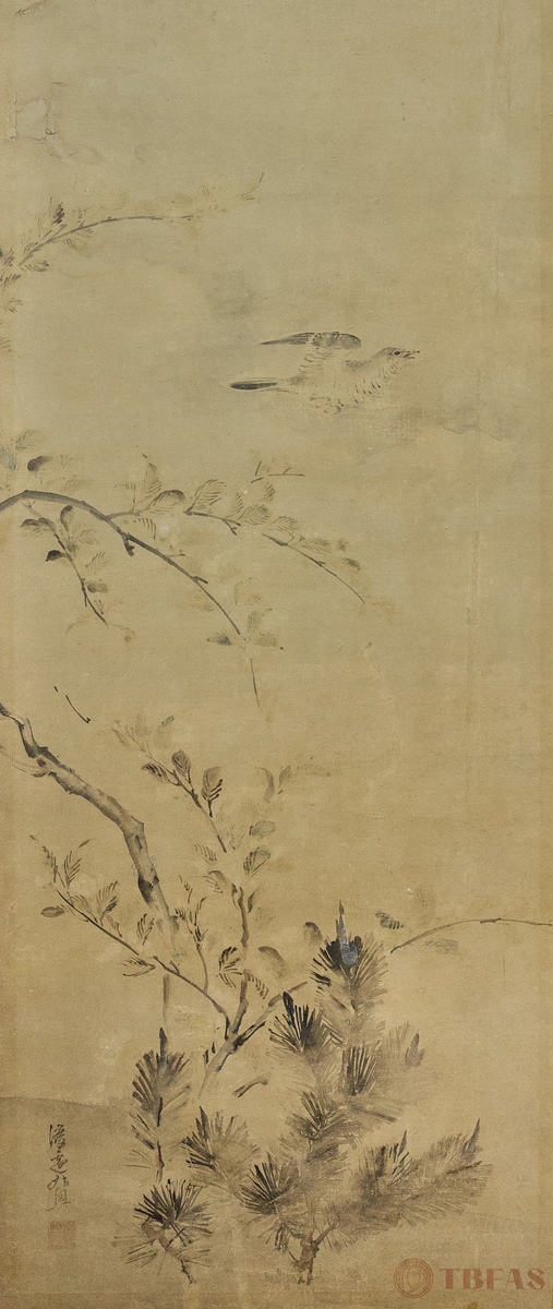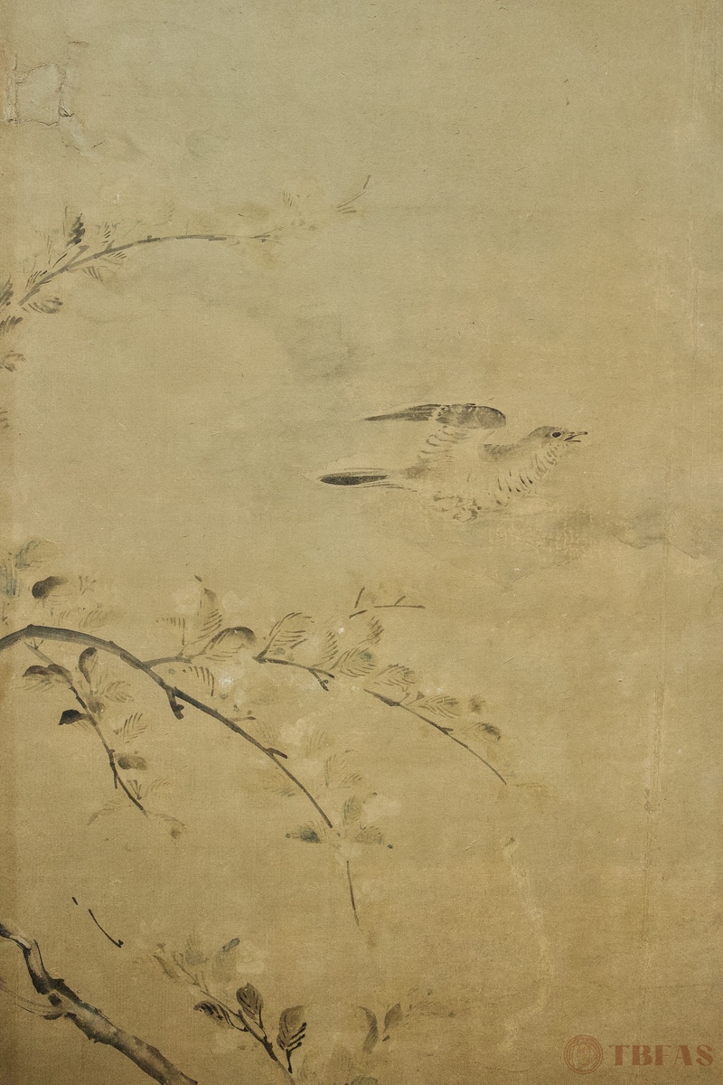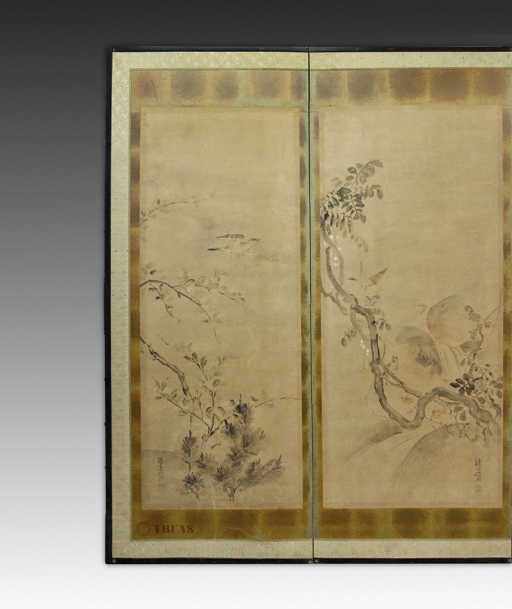 花鸟。明治(约1910)。水墨设色纸本四摺屏风。状况良好。超过100年手绘真迹。