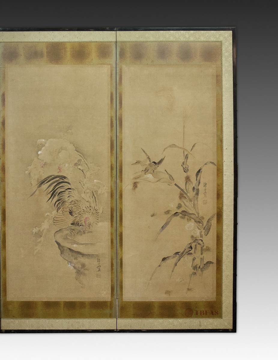 An original painting on paper mounted as a four-panel Japanese screen (byobu). Over one hundred years old, depicting a rooster in a landscape setting with trees and grasses.
