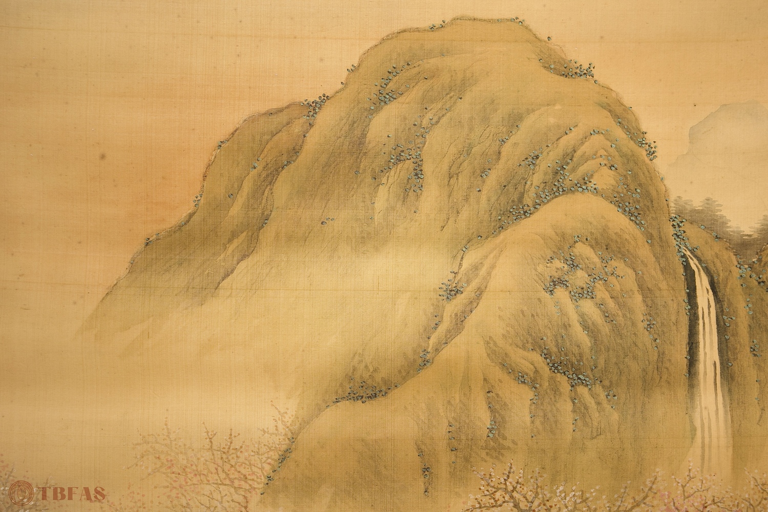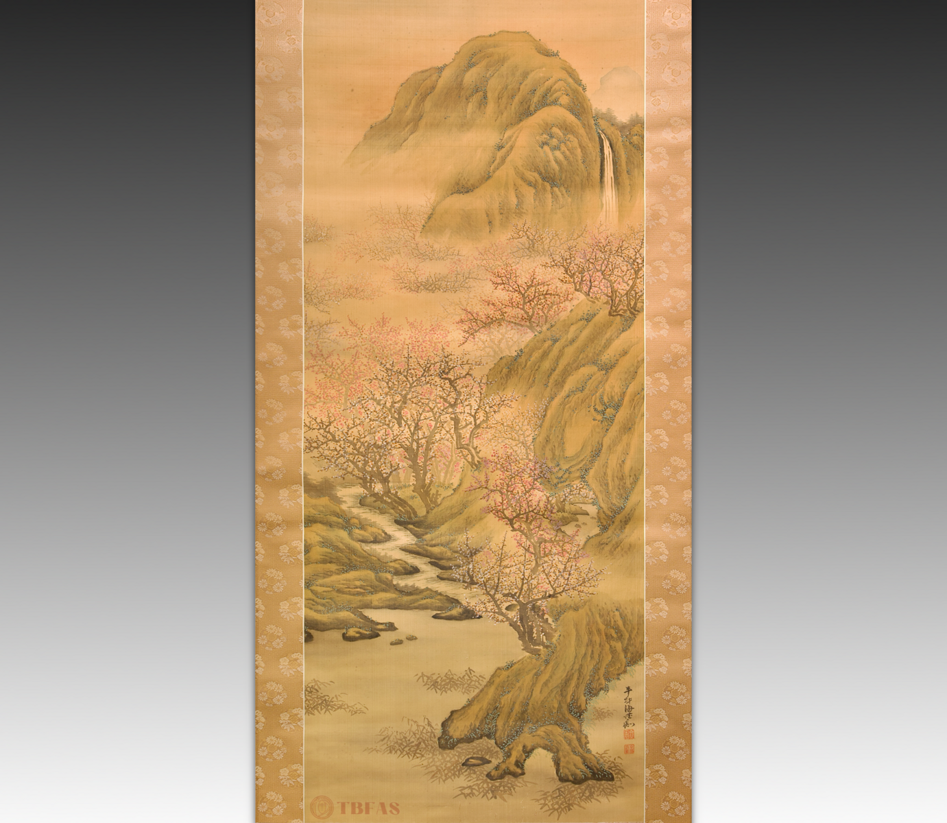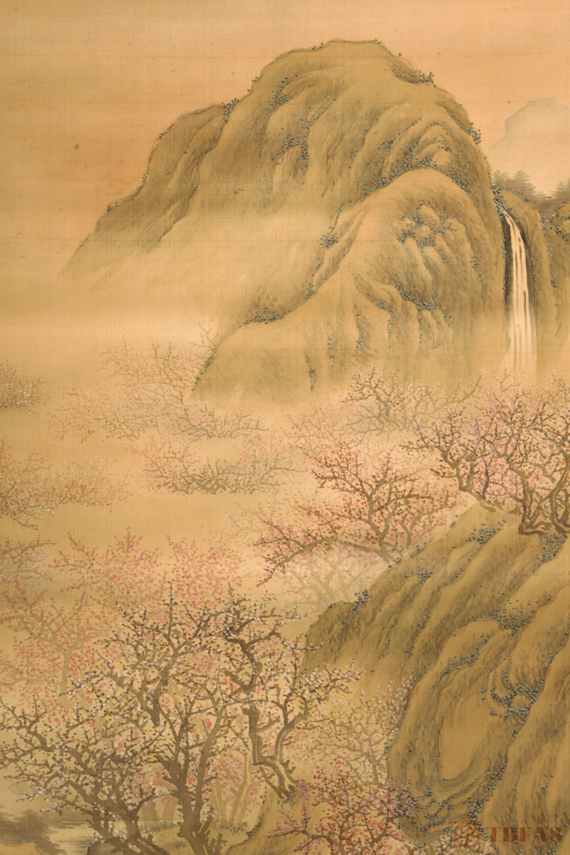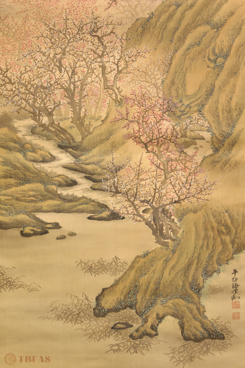 This 20th century painting depicts springtime in the mountains. Brush and ink with vibrant color.