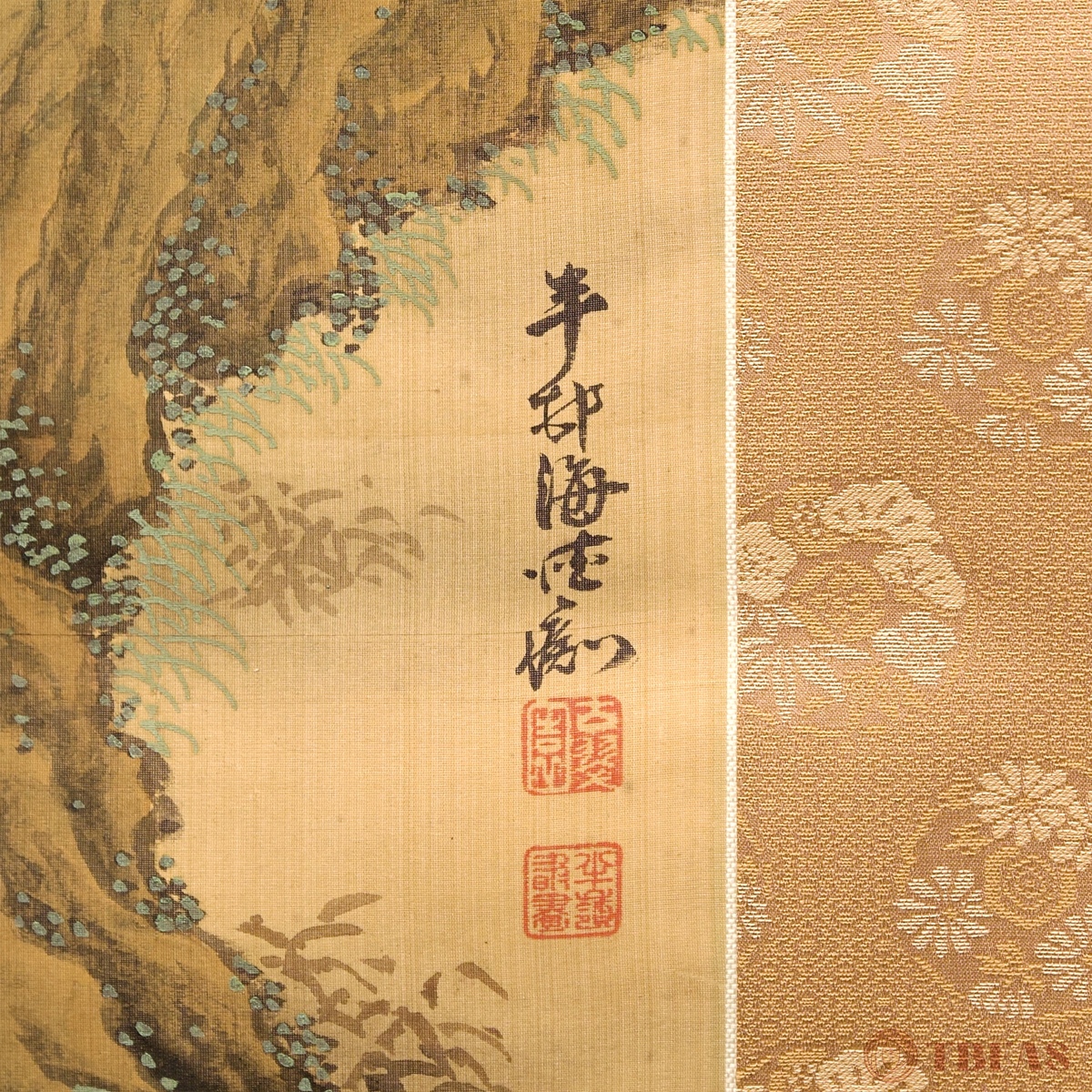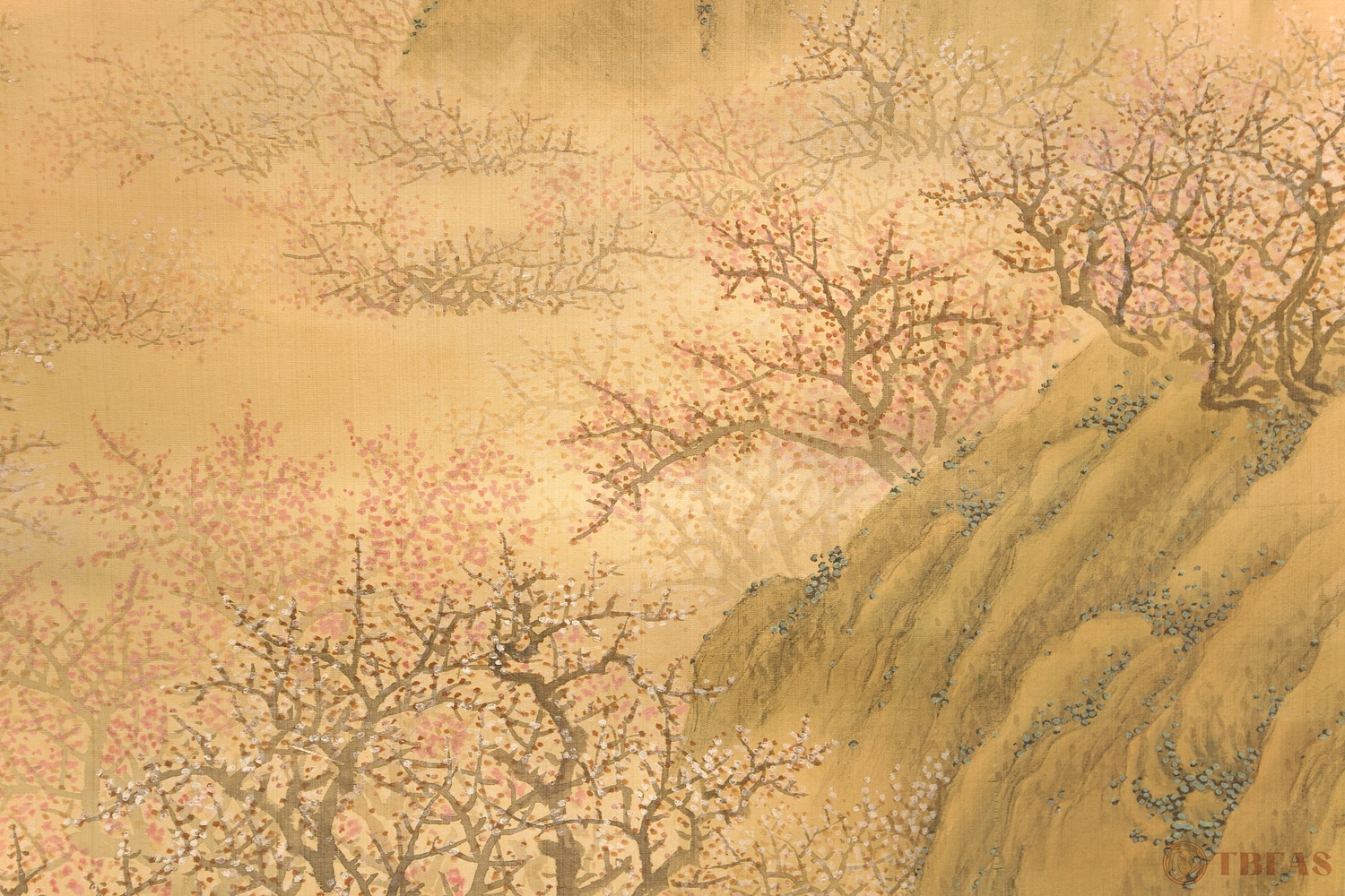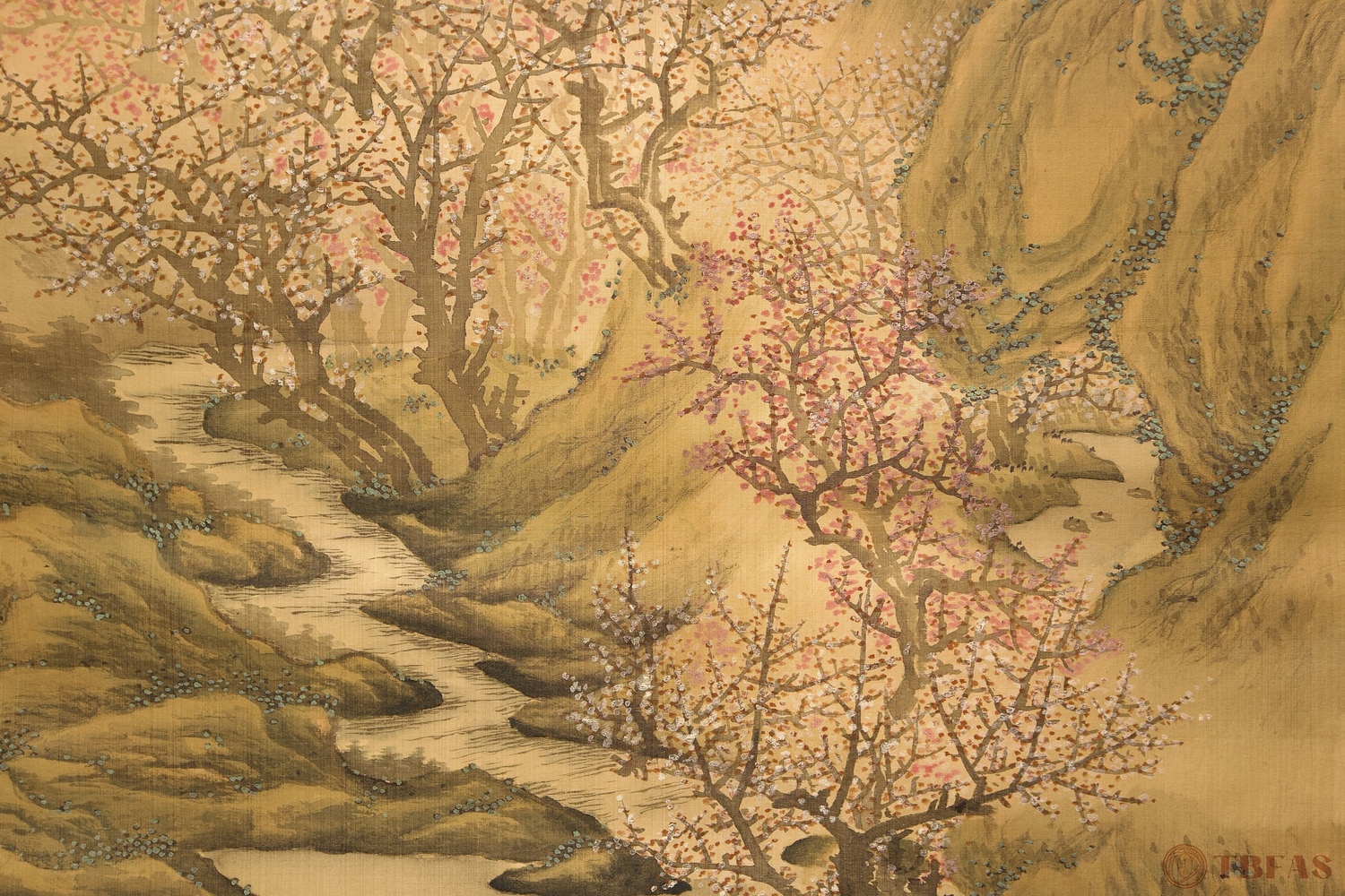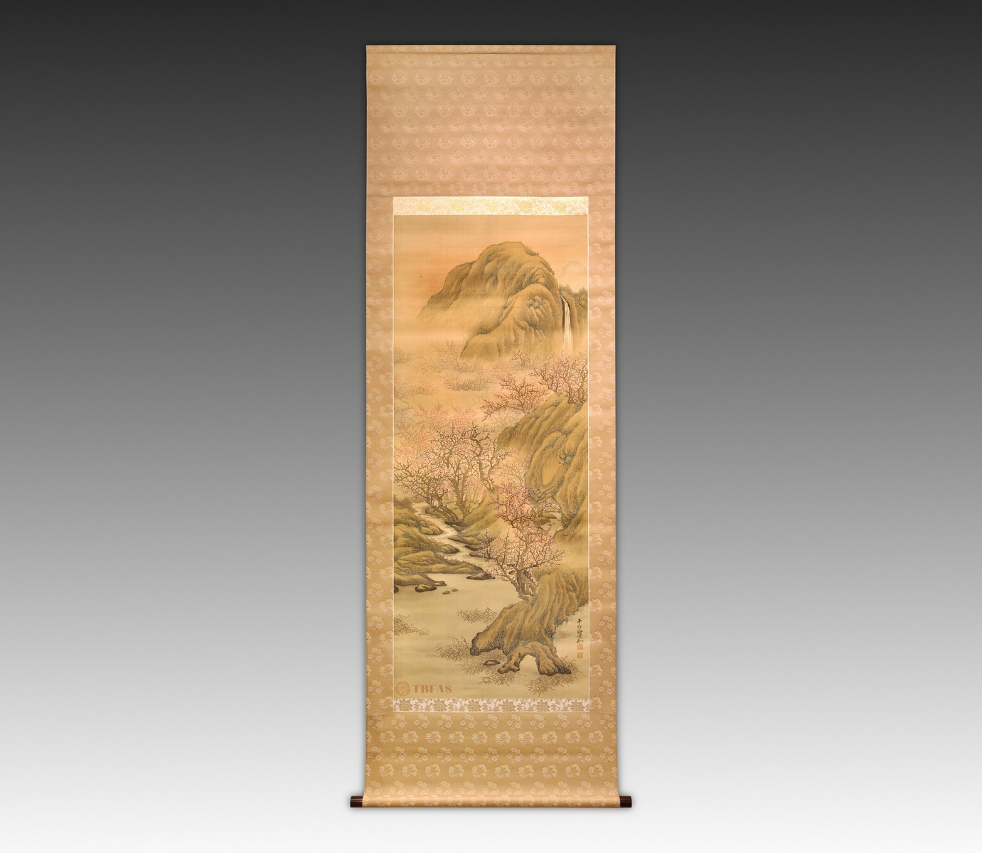 This 20th century painting depicts springtime in the mountains. Brush and ink with vibrant color.