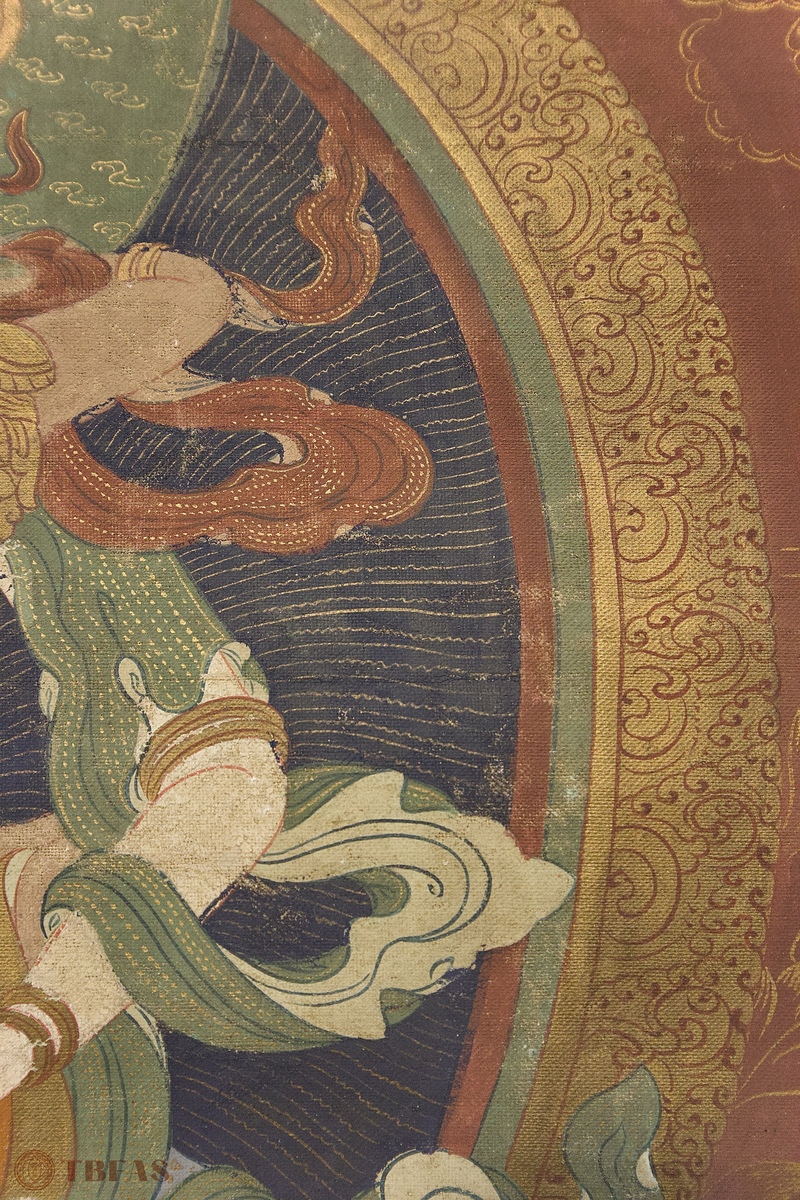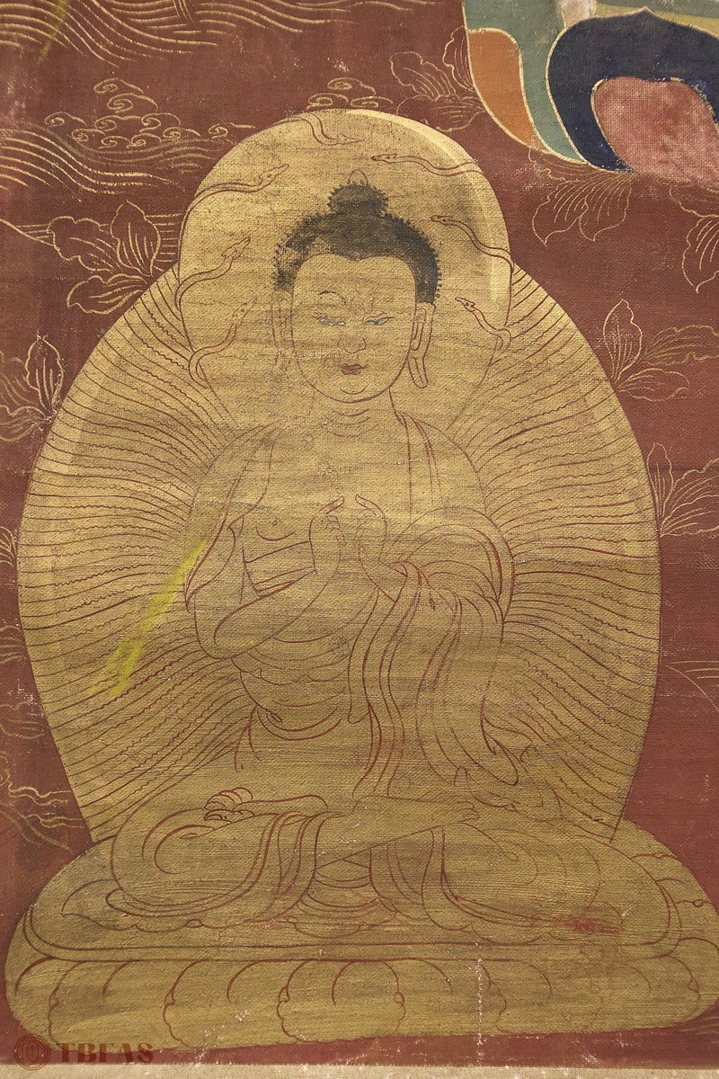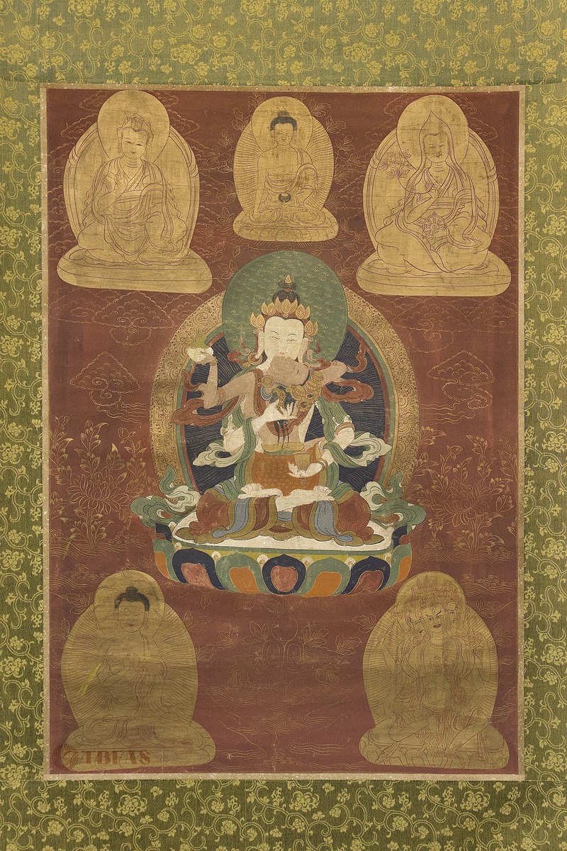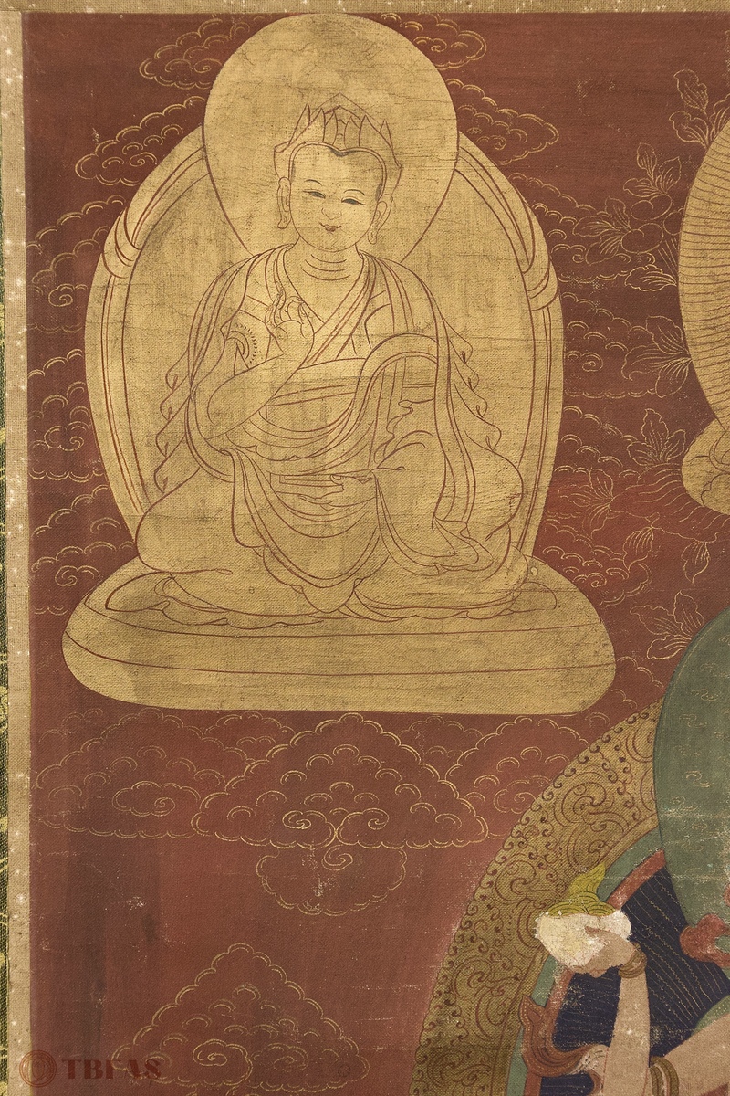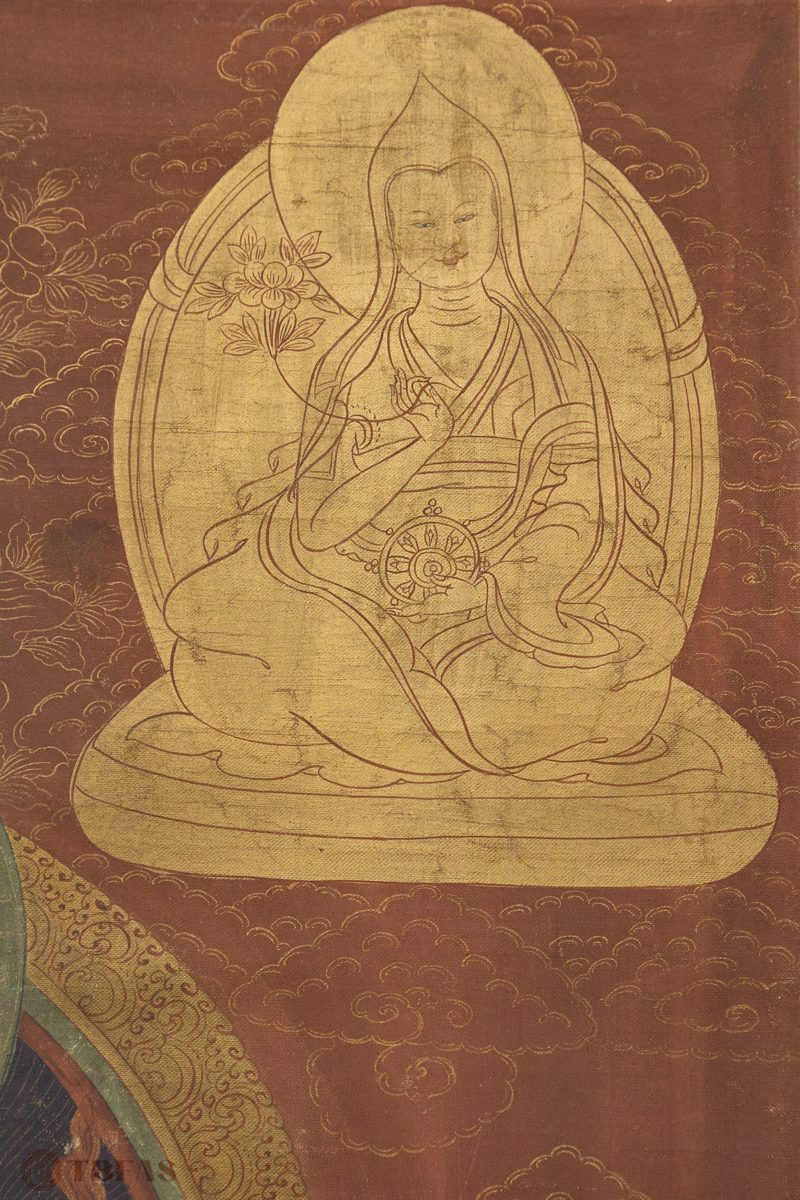 A Tibetan thangka mounted on a Chinese style scroll mounting.
