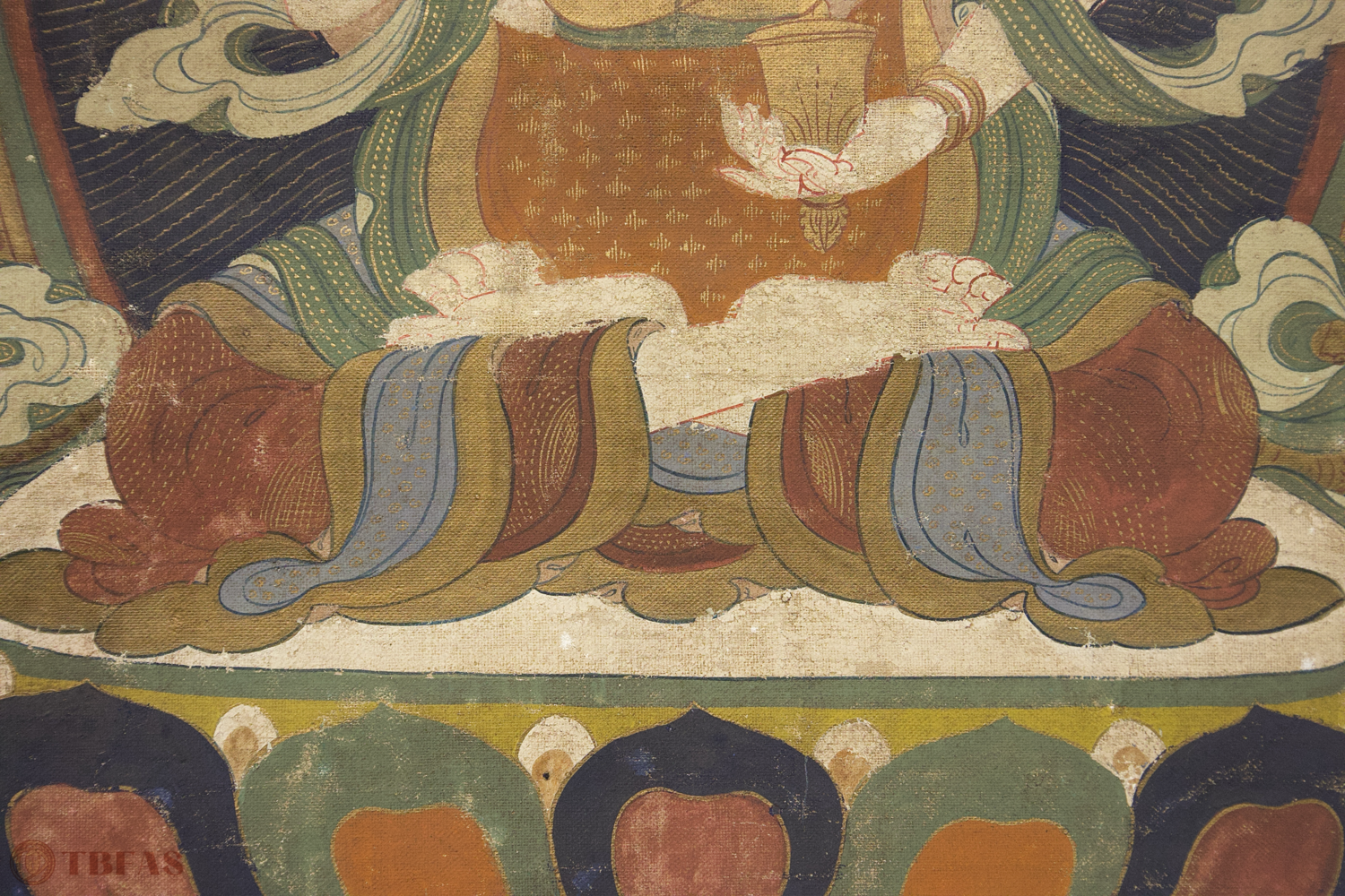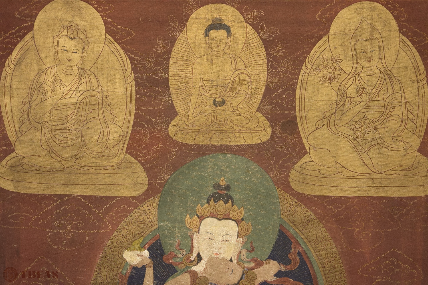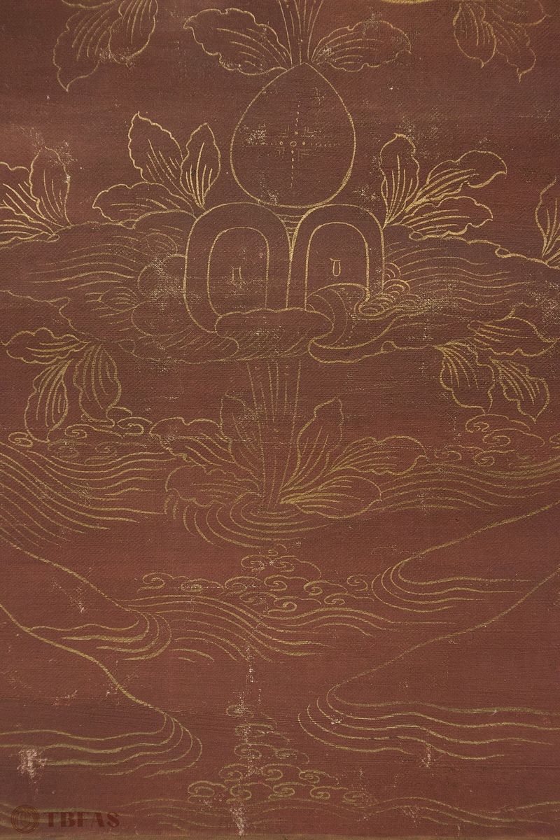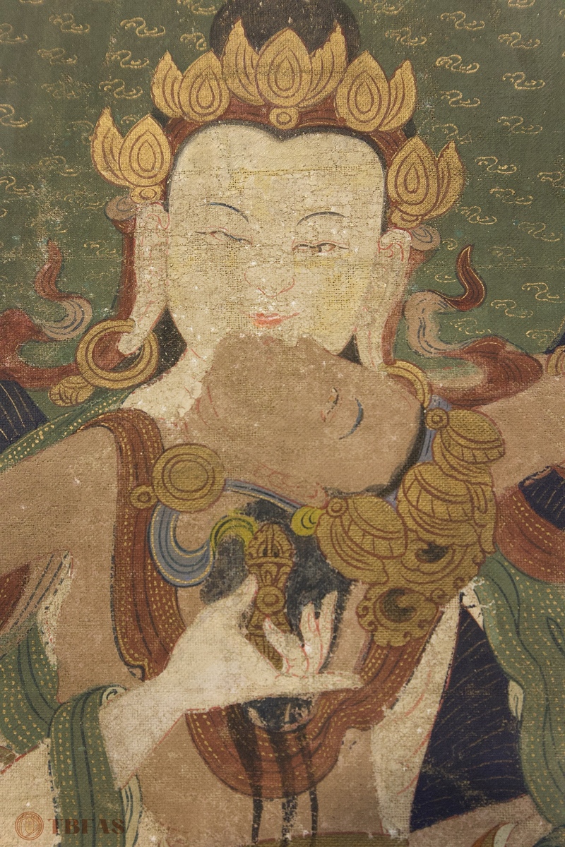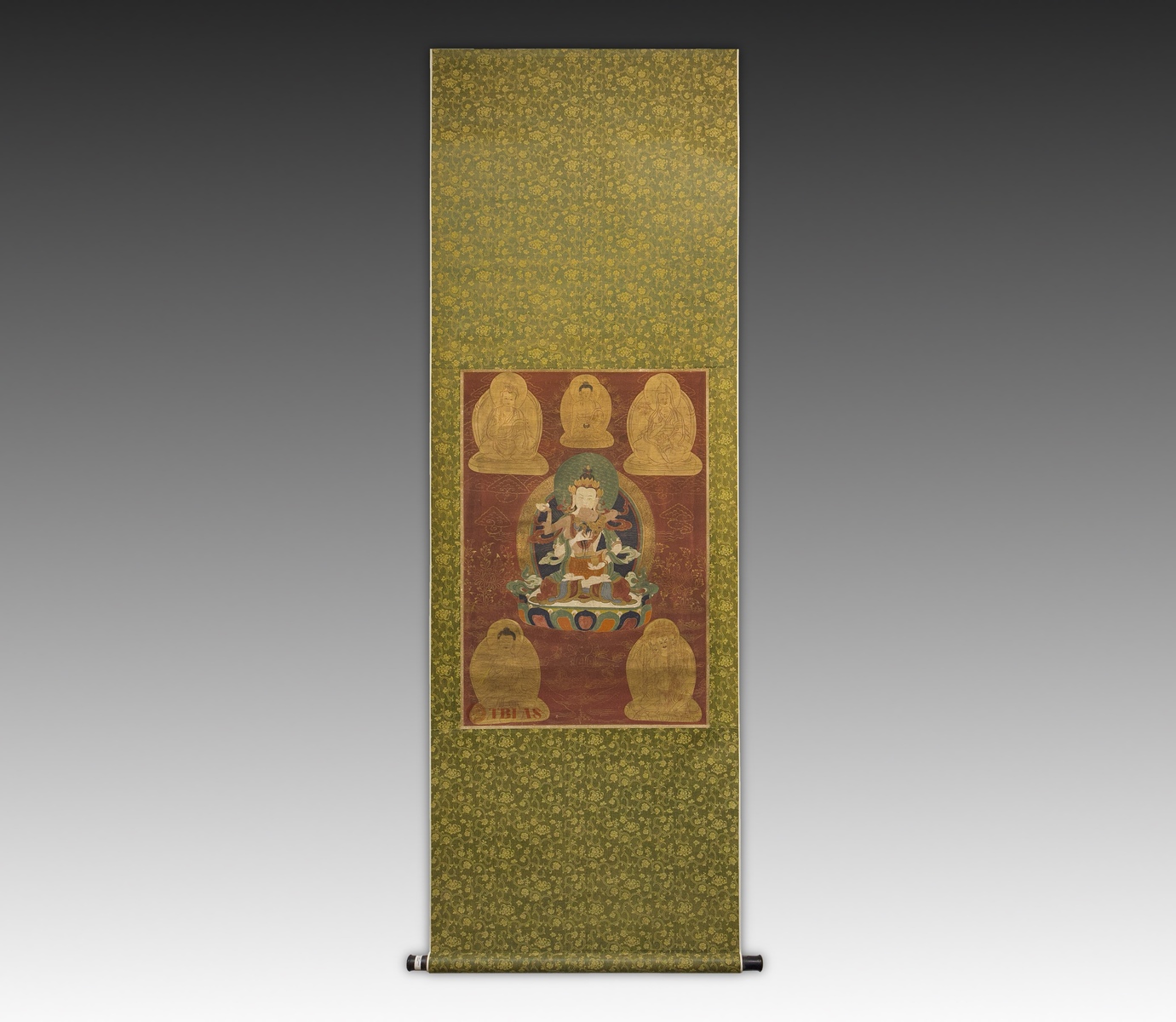 A Tibetan thangka mounted on a Chinese style scroll mounting.